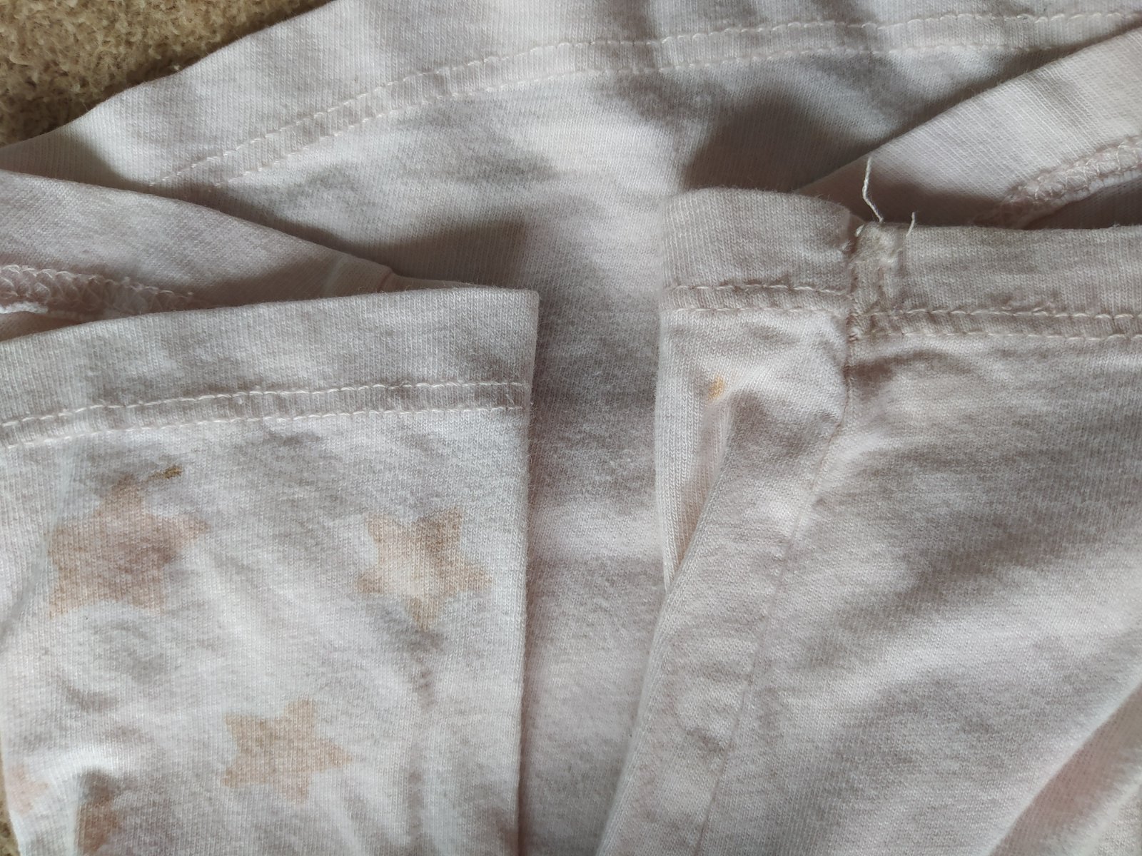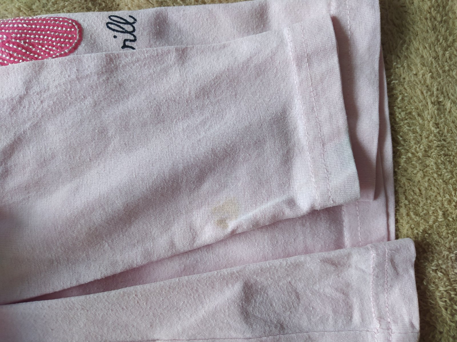 Hodně oblíbená = nošená, praná, takže spíše na donošení. Růžové pidi flíček, na modrém poničený obrázek. Cena za obě.