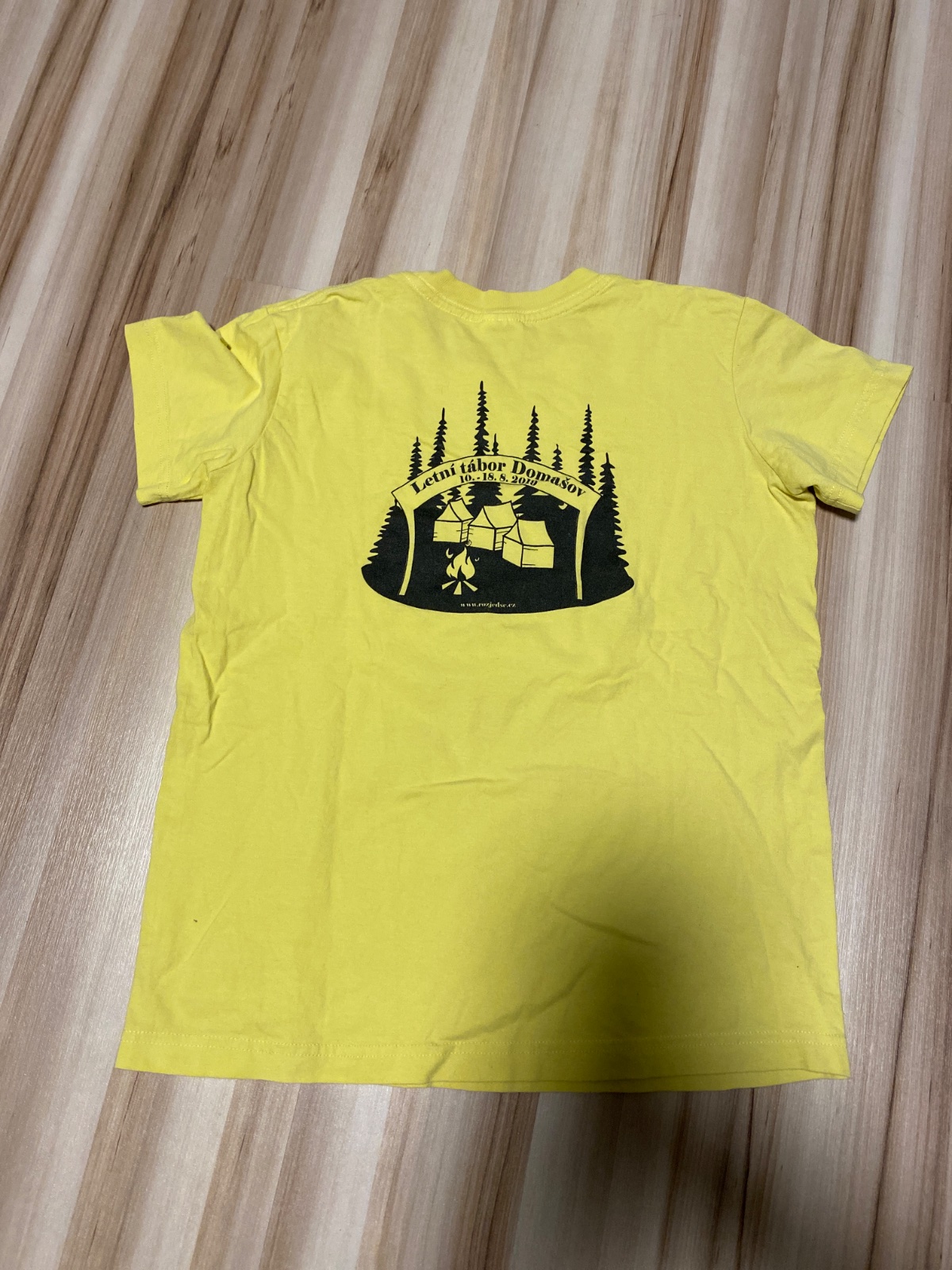 Svítivě žluté tričko, moc hezké. 100% bavlna. Nezničené, jen na předním díle 2 flíčky světlé, nešlo ani moc nafotit. Velikost 146/152