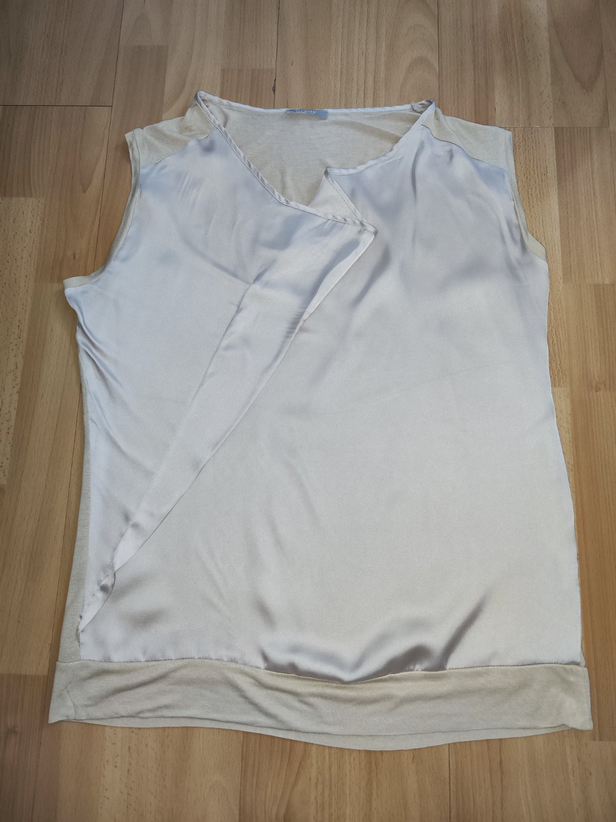 Prodám top Orsay, velikost cca L, rozměry – délka od ramen 66 cm, šířka v podpaží 58, 5 cm. Tento lehký top bez rukávů má originálně překládaný přední díl, který vytváří šikmý záhyb přes hrudník. Přední část je z hladké, jemně lesklé látky, která působí slavnostně, zadní část je z matnějšího materiálu, také lemování kolem průramků a spodního okraje. Minimálně nošený. Cena 100 Kč, v Brně možné osobní předání.