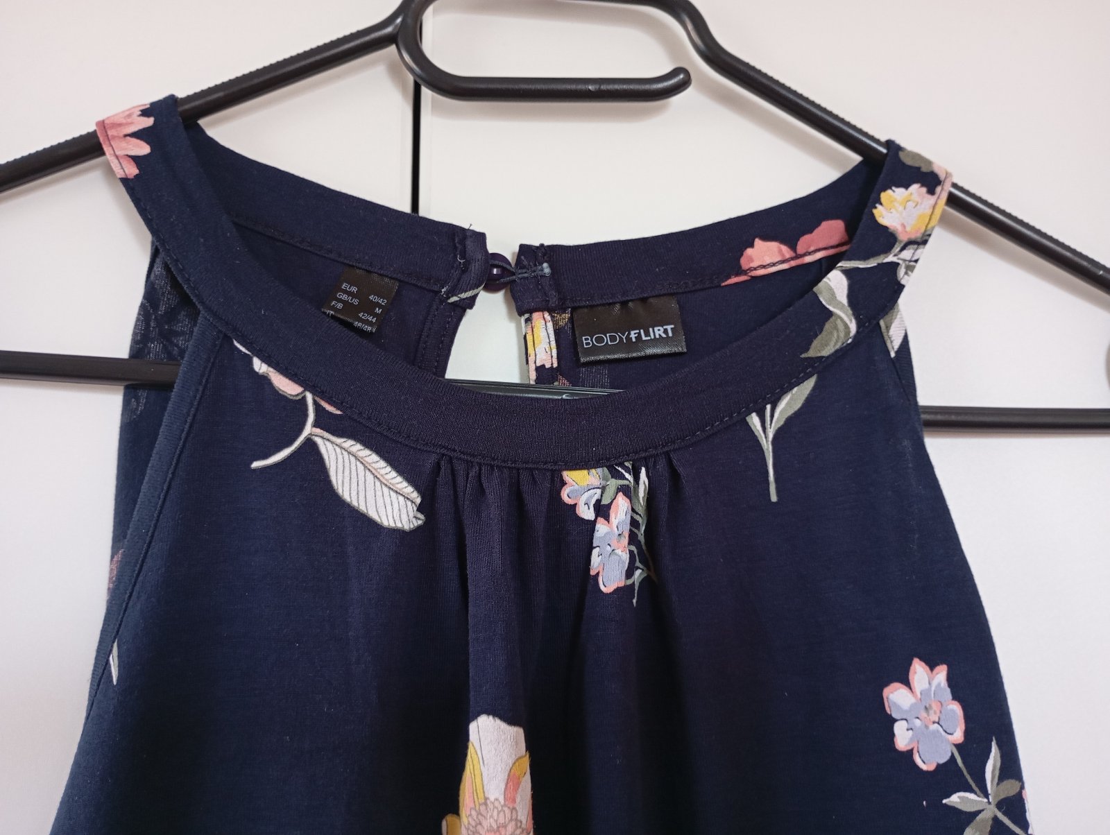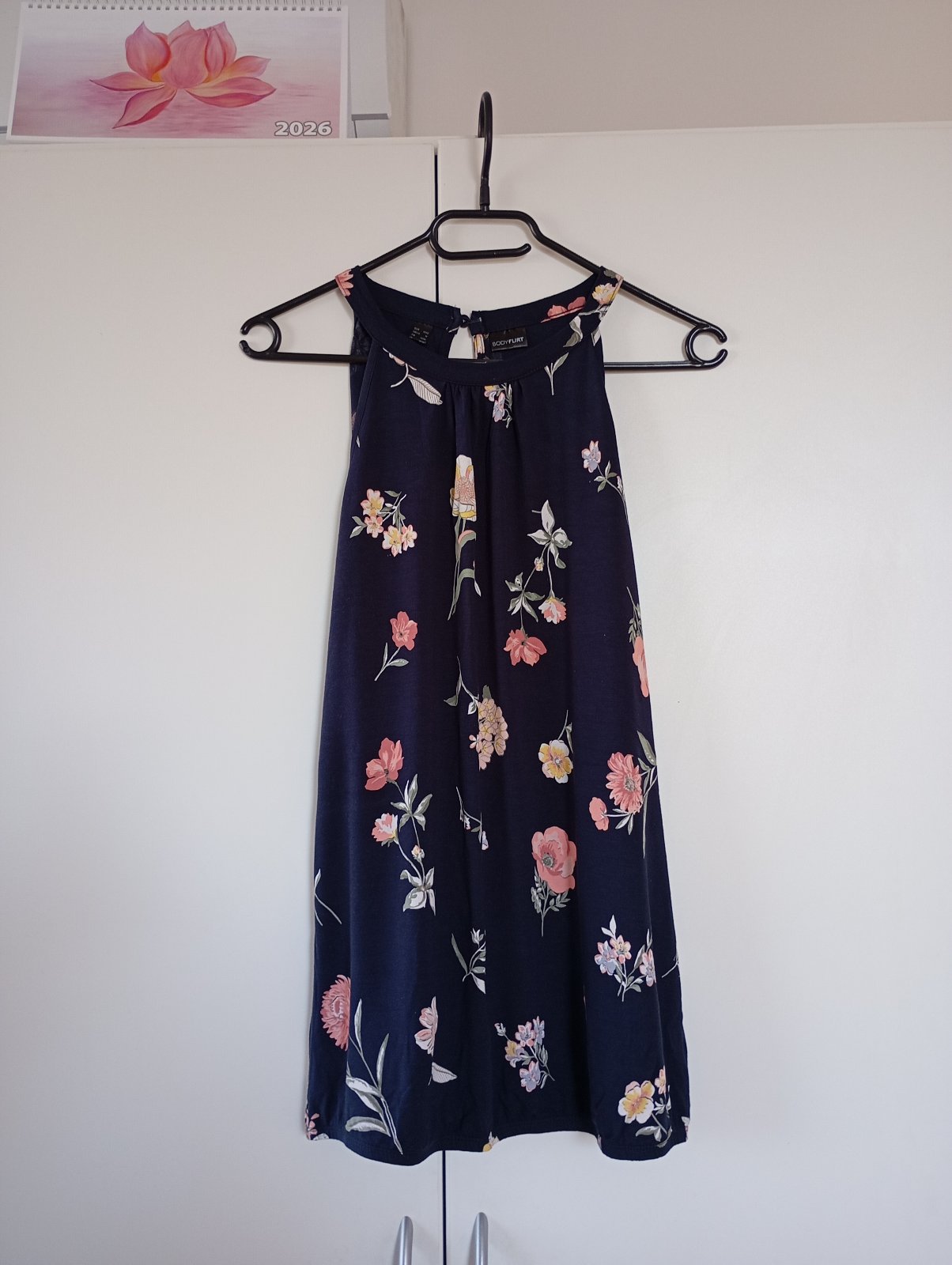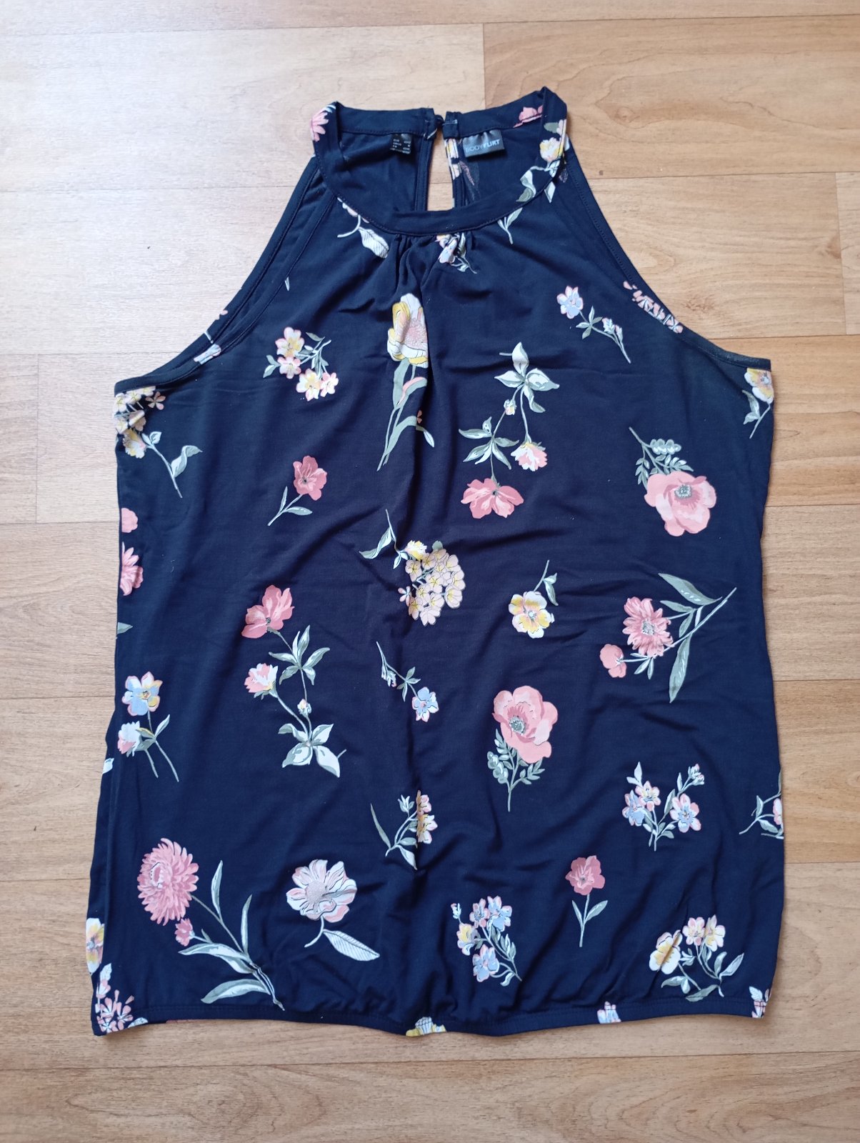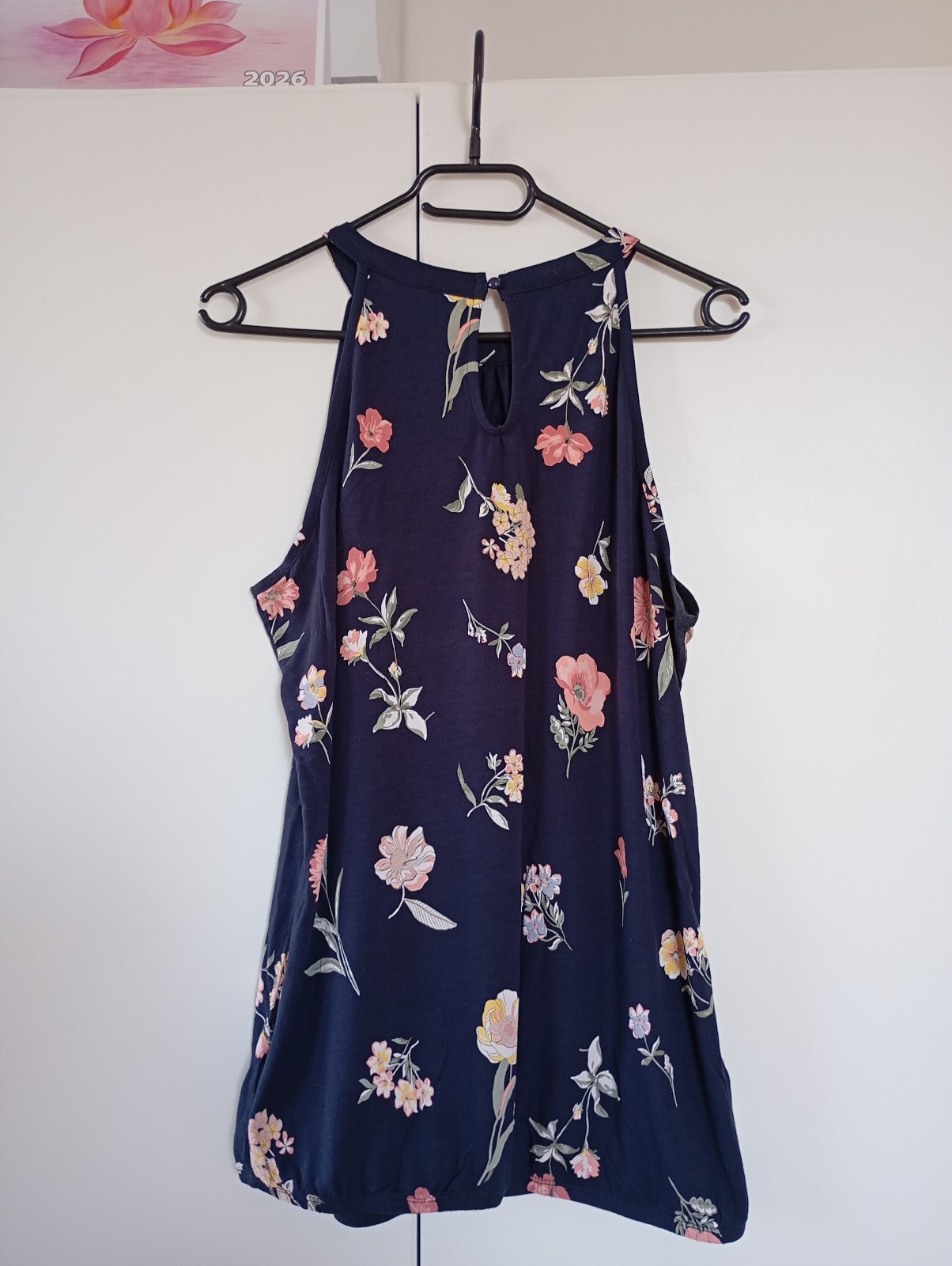 Prakticky nenošený, moc krásný. Tmavě modrý s květinami, zapínání vzadu na krku, guma ve spodním lemu. Velikost 40/42 sedí spíše 42.