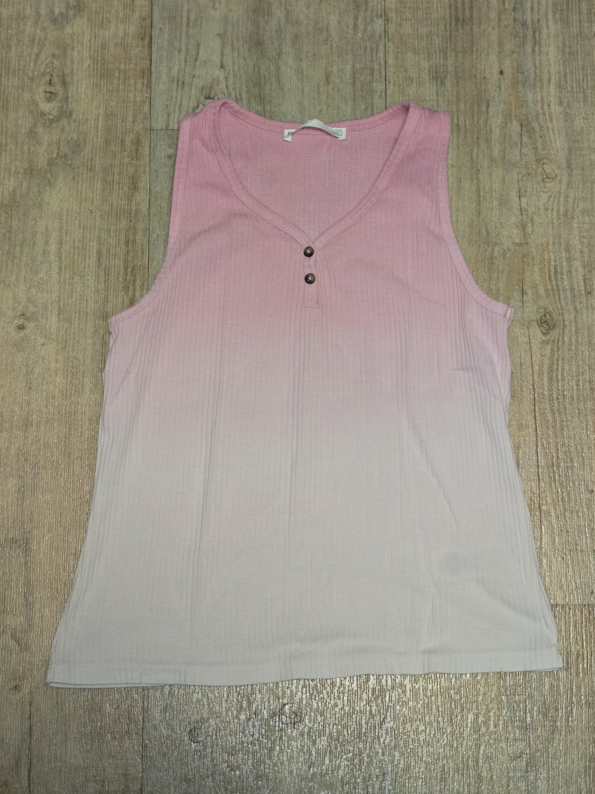 Žebrované tílko, ombre růžové a bílé, nošené.