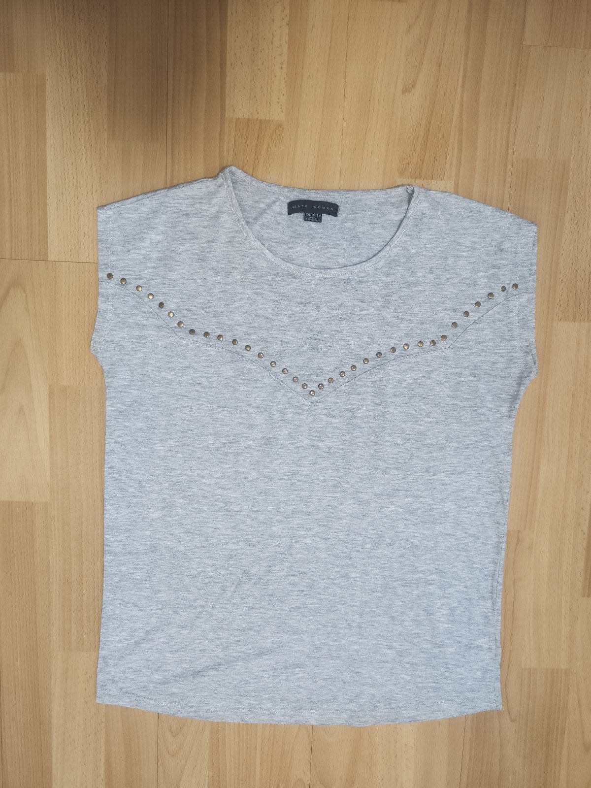 Prodám triko Gate Women, velikost M/38, může být i L, rozměry – délka od ramen na kraji 62 cm; šířka v podpaží 48 cm. Triko je vyrobeno z příjemného materiálu (95% bavlna, 5% viskóza). Ve světle šedé barvě. Má kulatý výstřih a jednoduchý, pohodlný střih. Přední část zdobí kovové cvočky uspořádané do šikmého vzoru, který dodává tričku jemný ozdobný detail. Cena 90 Kč, v Brně možné osobní předání.