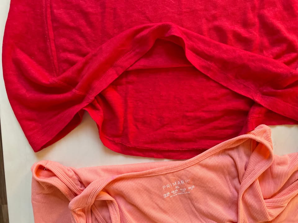 425.han. nabízím k prodeji červené tílko Esmara a k tomu růžové Primark s vadou navíc zdarma., Vel oboje XL a 46/48 tedy cca 3XL, měřte. Meruňkové má u dolního lemu růžový flíček (pak jsem našla 2 u boku a dolním lemu na zadní straně. Jak jsou růžové púři focení jsem si těch zadních nevšimla. Bylo nošené málo, je na nošení příjemné, takový žebrový materiál a na doma nebo na zahrádku určitě poslouží. Možná se podažří vyprat. Nošené, až na uvedené Nošené, až na uvedené bez vad, krásné