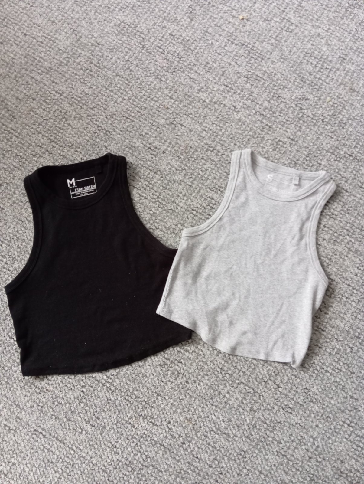 Dívčí krátká tílka, černé vel. M, šedé vel. S. Nošená jedno léto, bez skvrn. Cena za obě.