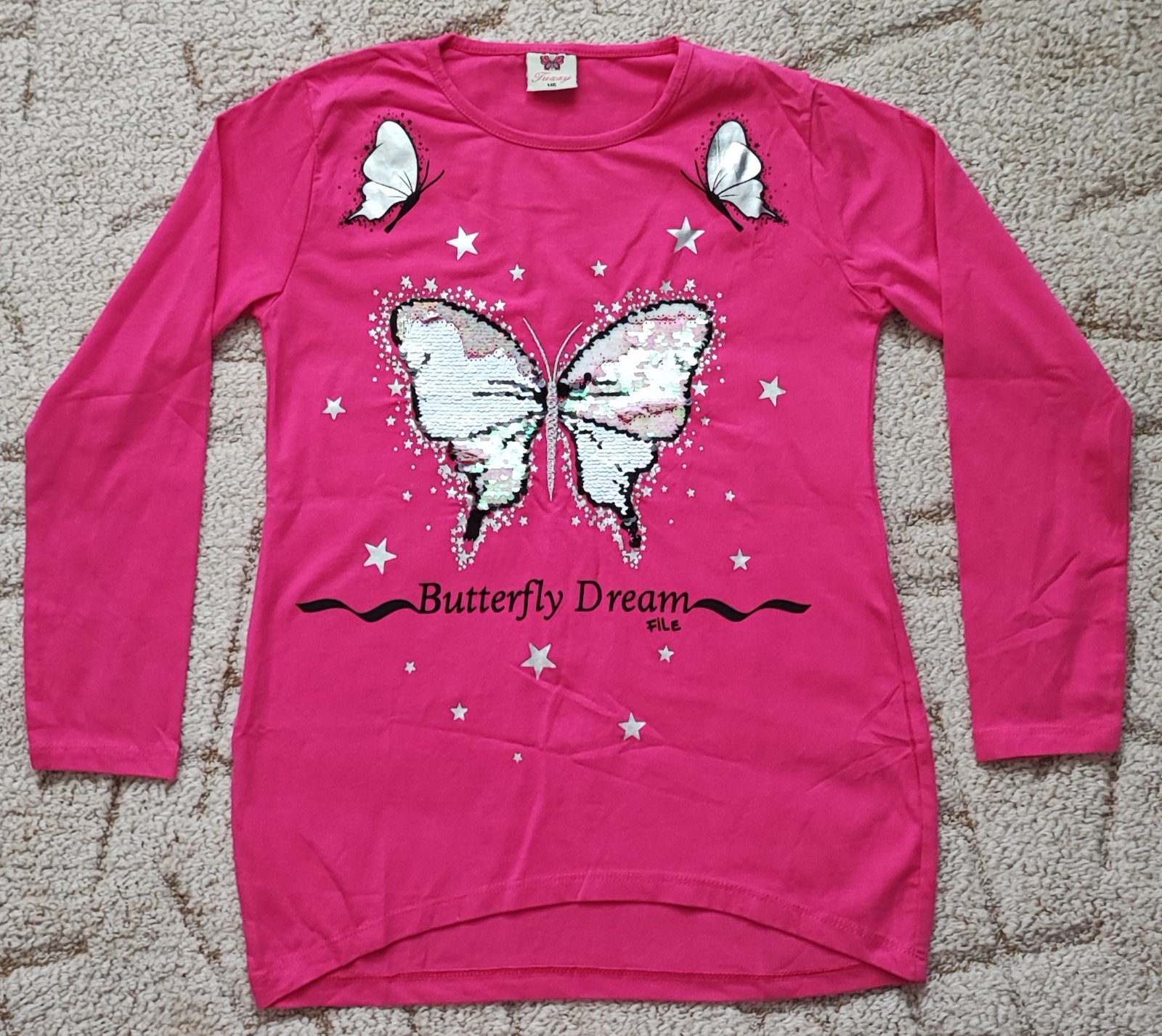 Prodám velmi hezkou dívčí halenku s dlouhým rukávem zn. George, velikost 146 -152, barva tmavě růžová, na předním díle potisk a zdobení, efekt dvojitého rukávu. Nošená, ale bez vad, ve velmi dobrém...