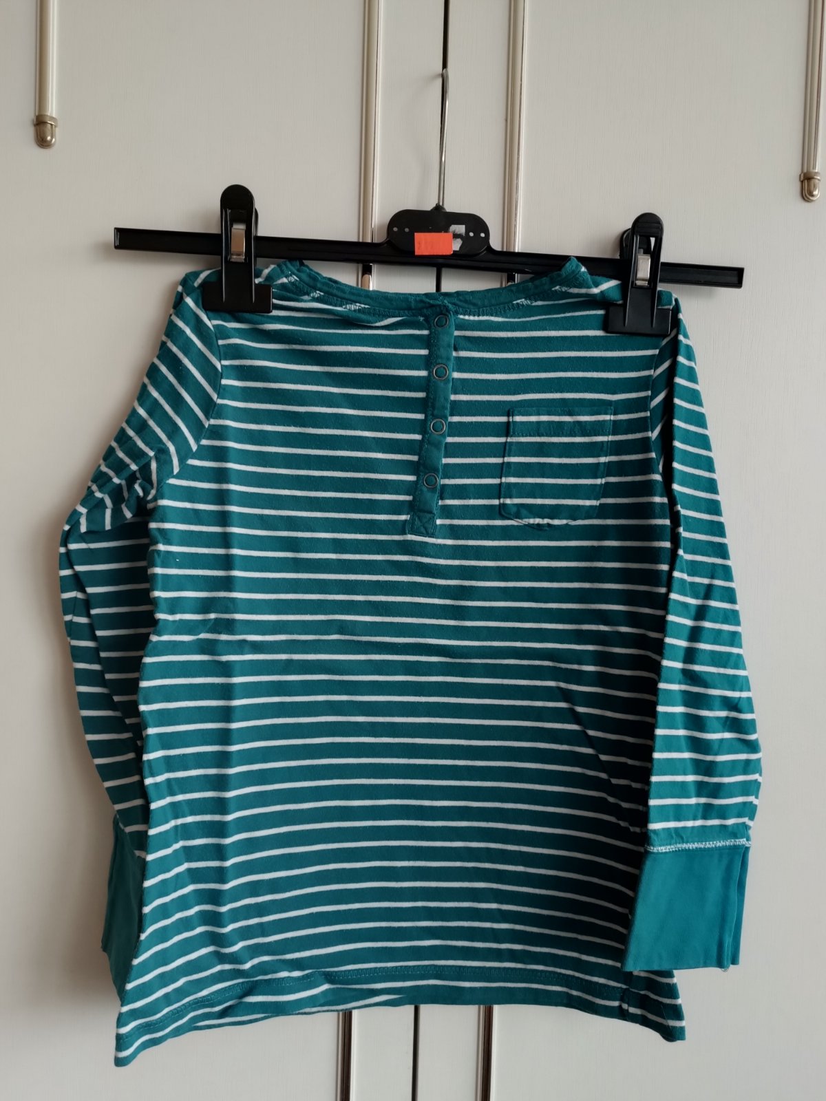NOVÉ - JEN BEZ CEDULKY. KVALITNÍ SILNĚJŠÍ BAVLNA 98% A 2%PES. PĚKNÁ KOMBINACE BAREV DO PRUHŮ - PETROLEJOVÁ, ŠEDÁ A ČERNÁ. DÉLKA 75 CM, RUKÁV OD VÝSTŘIHU 77 CM, ŠÍŘKA 2X62 CM A 46 ZNAČKA: VAN VAAN
