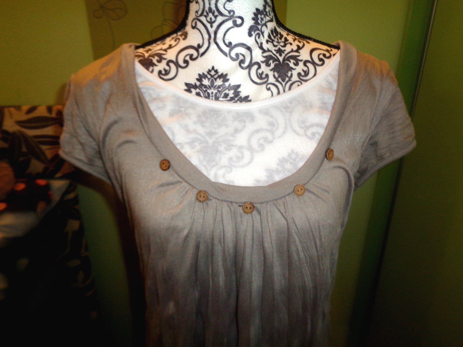 PŘÍJEMNÝ MAČKANÝ MATERIÁL 65% BAVLNA, 30% PES, 5% ELASTEN. PRUŽÍ. MÁ ROZŠIŘUJÍCÍ STŘIH - LICHOTÍ POSTAVĚ. BÍLÁ VSADKA U VÝSTŘIHU, VÝSTŘI ZDOBENÝ KNOFLÍCKY - PĚKNÁ TMAVŠÍ BÉŽOVÁ BARVA. NOŠENÝ - MÍRNÉ ZNÁMKY NOŠENÝ - BEZ VADY.
