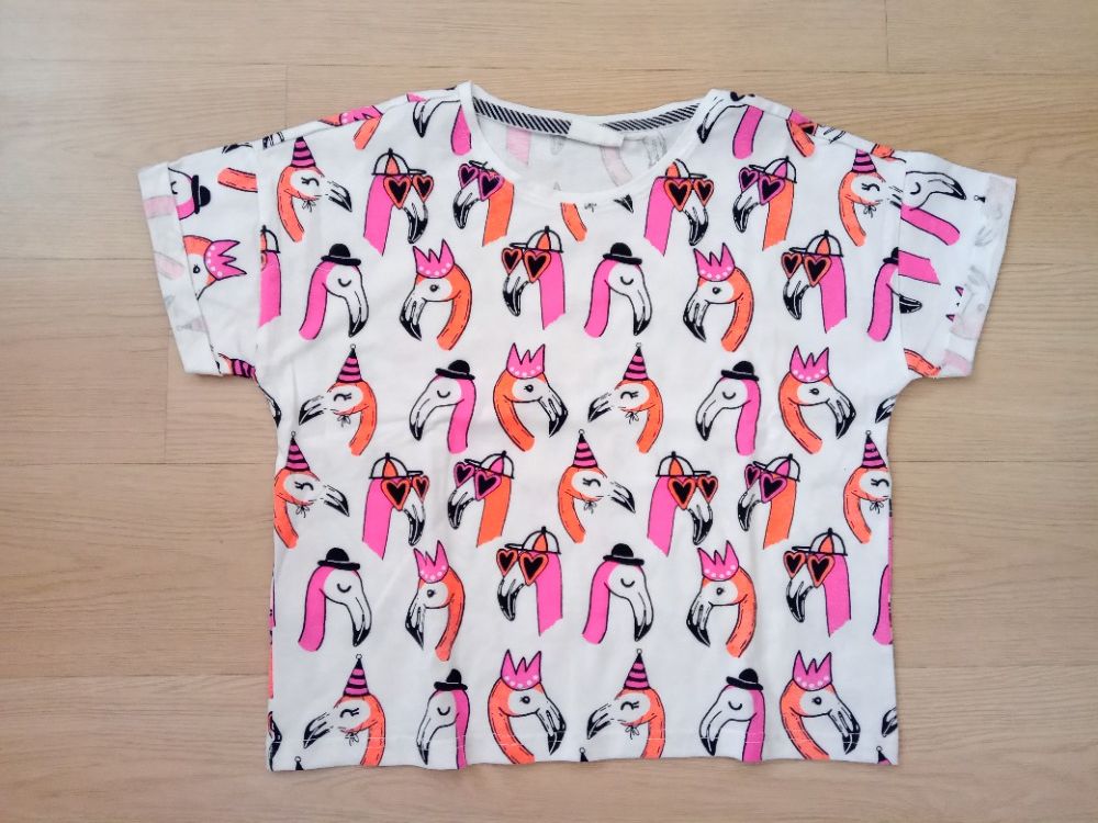Prodám crop-top bílé barvy s plameňáky, bez kazů, fleků a žmolků, jako nový. Velikost 152.
