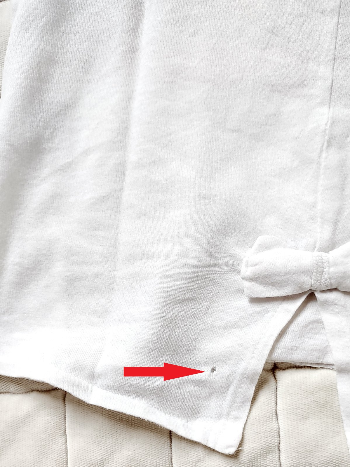 Nošené, na zadním šůsku dírka, viz foto. Velikost je menší než udává cedulka. Řadím do 134
