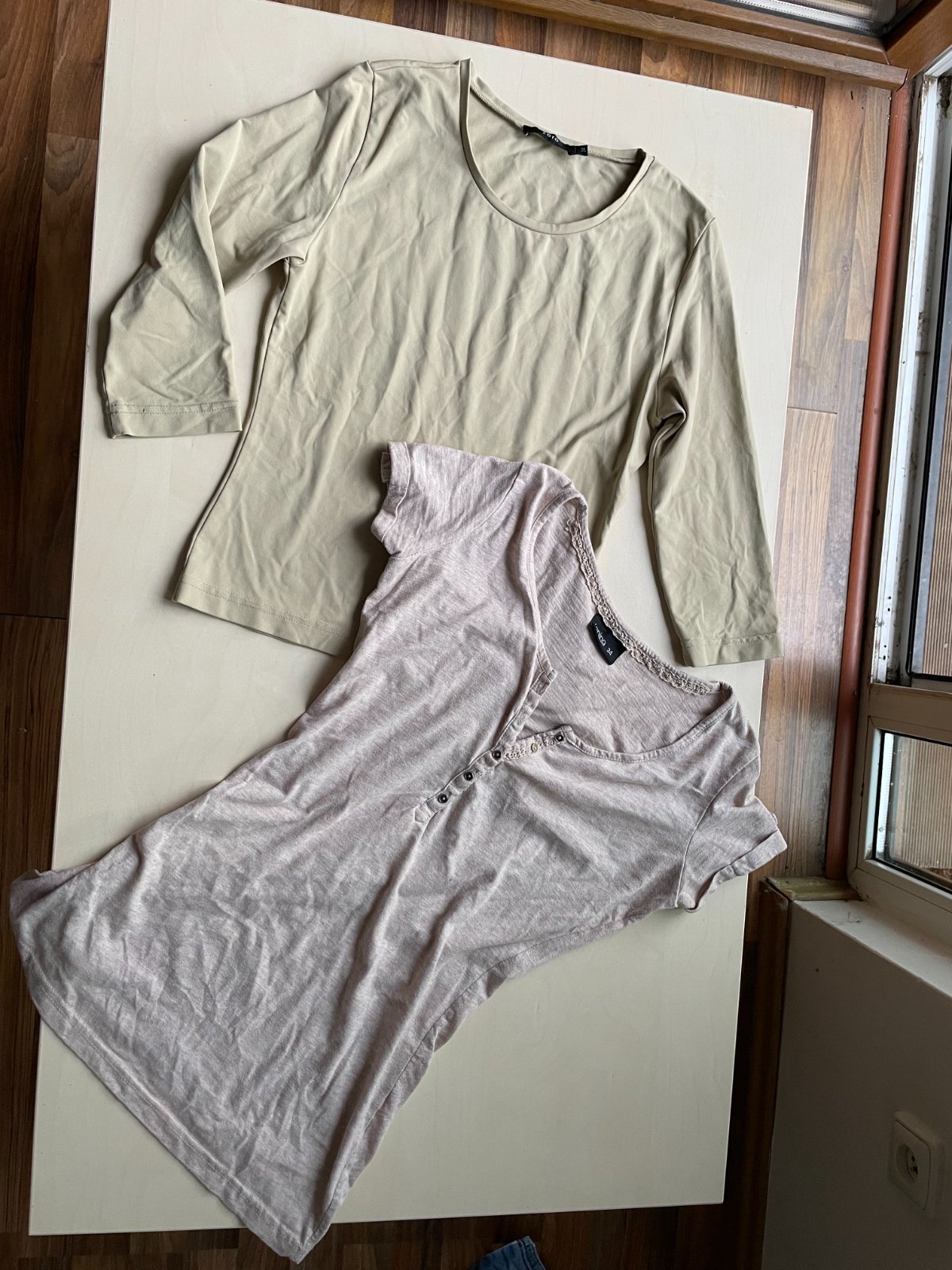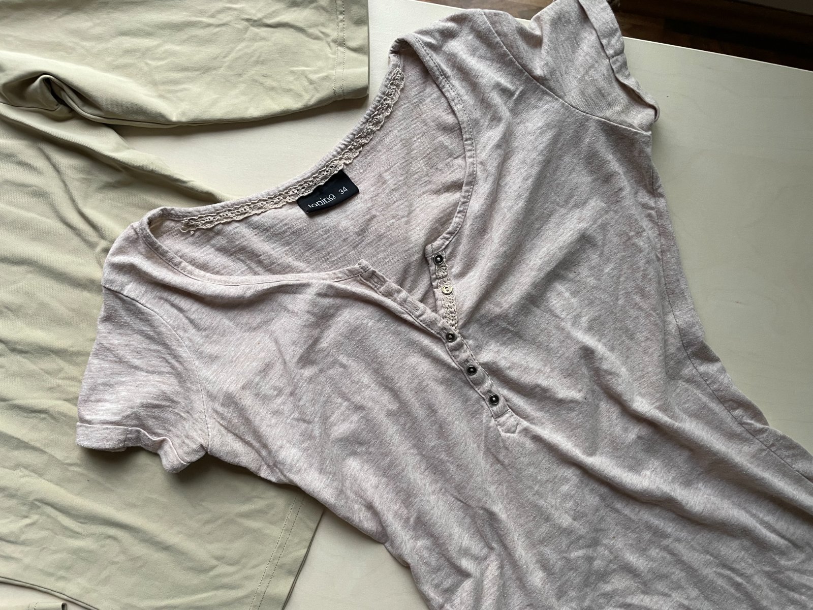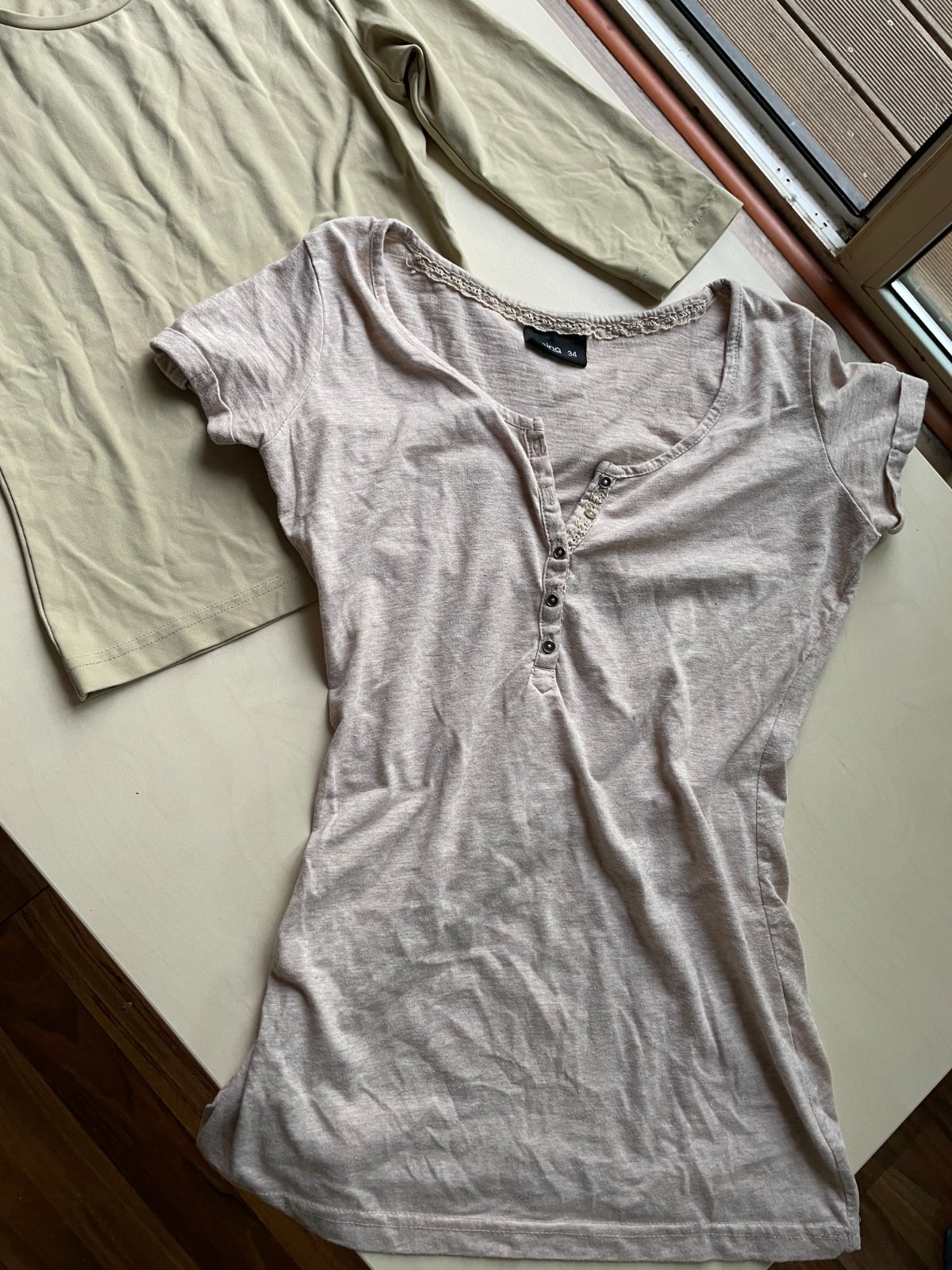 hol. nabízím k prodeji tyto 2 béžová trika, vel obojí 34/XS. Jedno melírované taková teplejší béžová melírovaná. Dolní lem ve vnitřním založení je v jednom kousku vada v přišití vnitřního lemu a není zevnitř ohnutí lemu přišito - je to uvnitř a tedy ničemu nevadí. Maličko prací chloupek, zaniká v melírování a běžné u těchto materiálů, je stále krásné.. Složení není uvedeno - štítek už je odstřižen. Délka 62, prsa 37-45