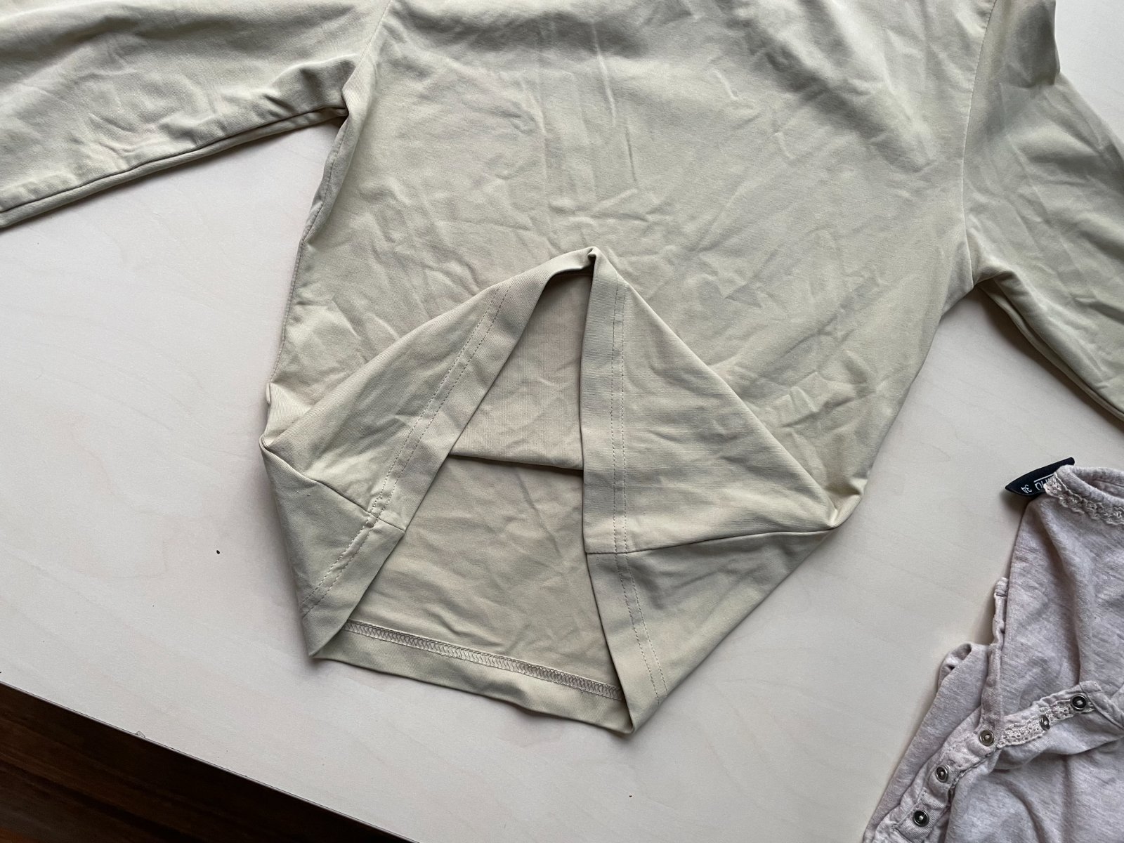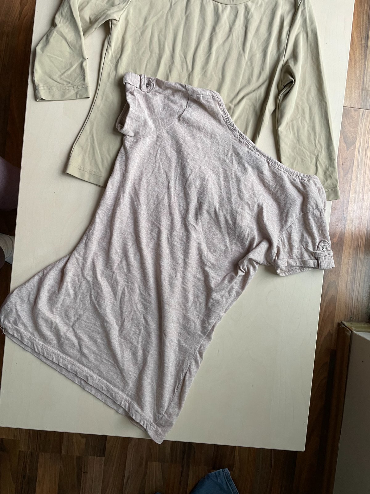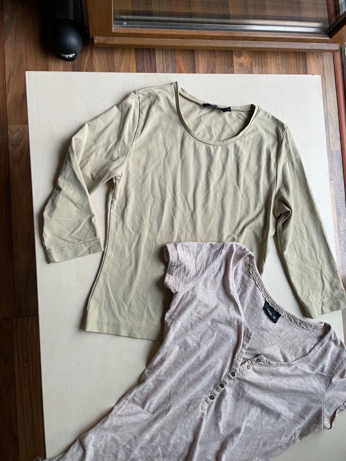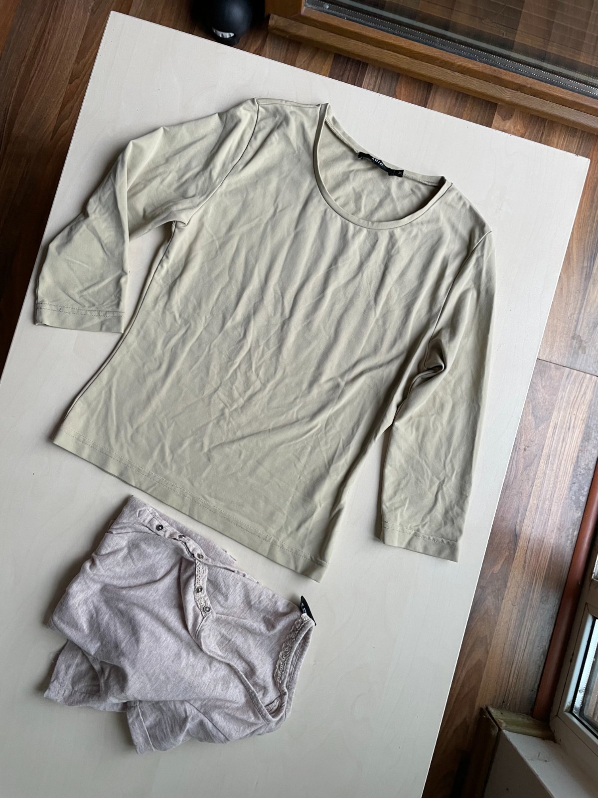 hol. nabízím k prodeji tyto 2 béžová trika, vel obojí 34/XS. Jedno melírované taková teplejší béžová melírovaná. Dolní lem ve vnitřním založení je v jednom kousku vada v přišití vnitřního lemu a není zevnitř ohnutí lemu přišito - je to uvnitř a tedy ničemu nevadí. Maličko prací chloupek, zaniká v melírování a běžné u těchto materiálů, je stále krásné.. Složení není uvedeno - štítek už je odstřižen. Délka 62, prsa 37-45