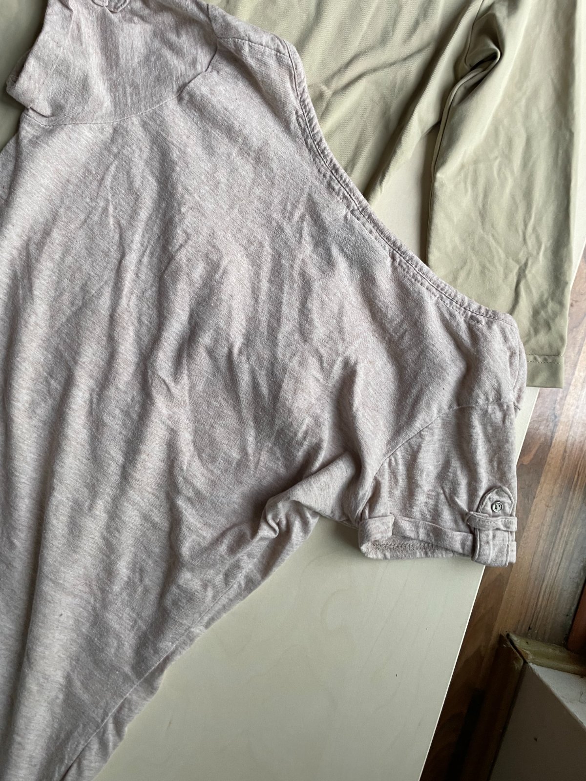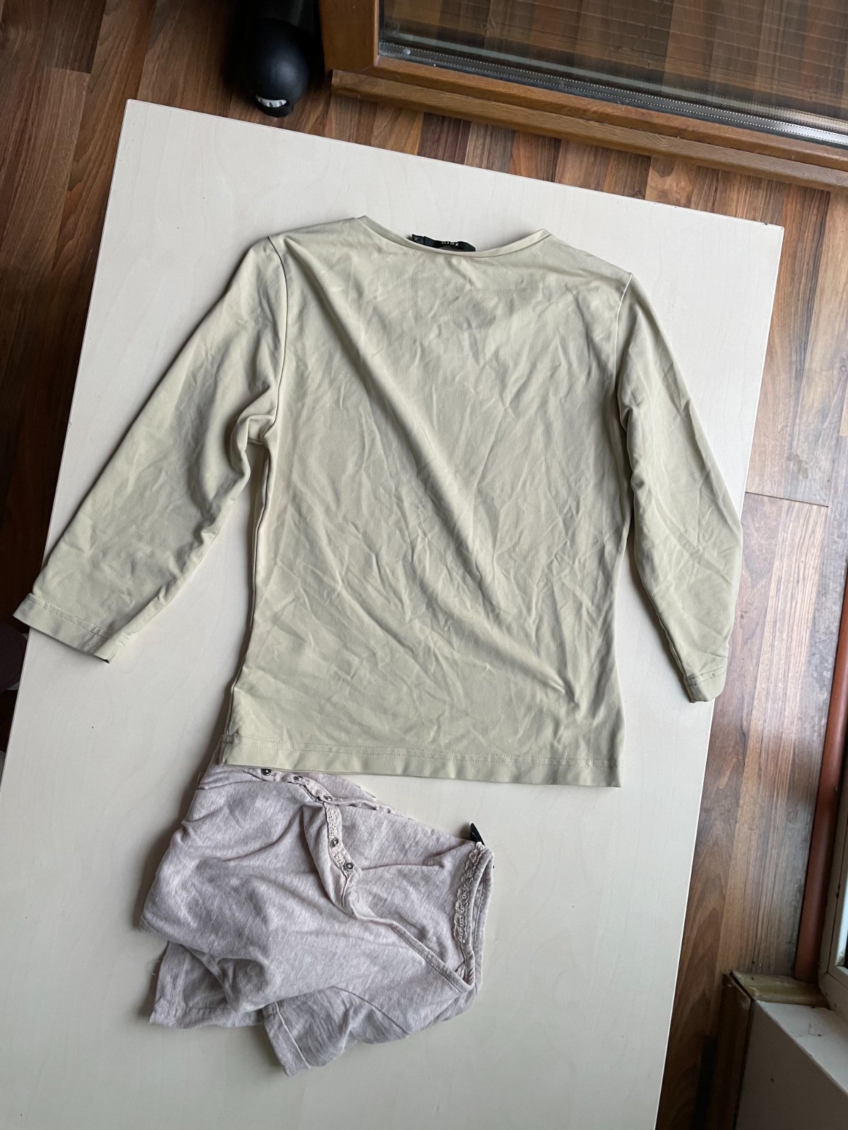 Druhé je takový béžový do zelena odstín. Rukáv 3/4, materiál takový umělý, jako nylonový, pružný - 90% meryl, 10% elasten. Délka 49, prsa 36-50, rukáv od ramene 38