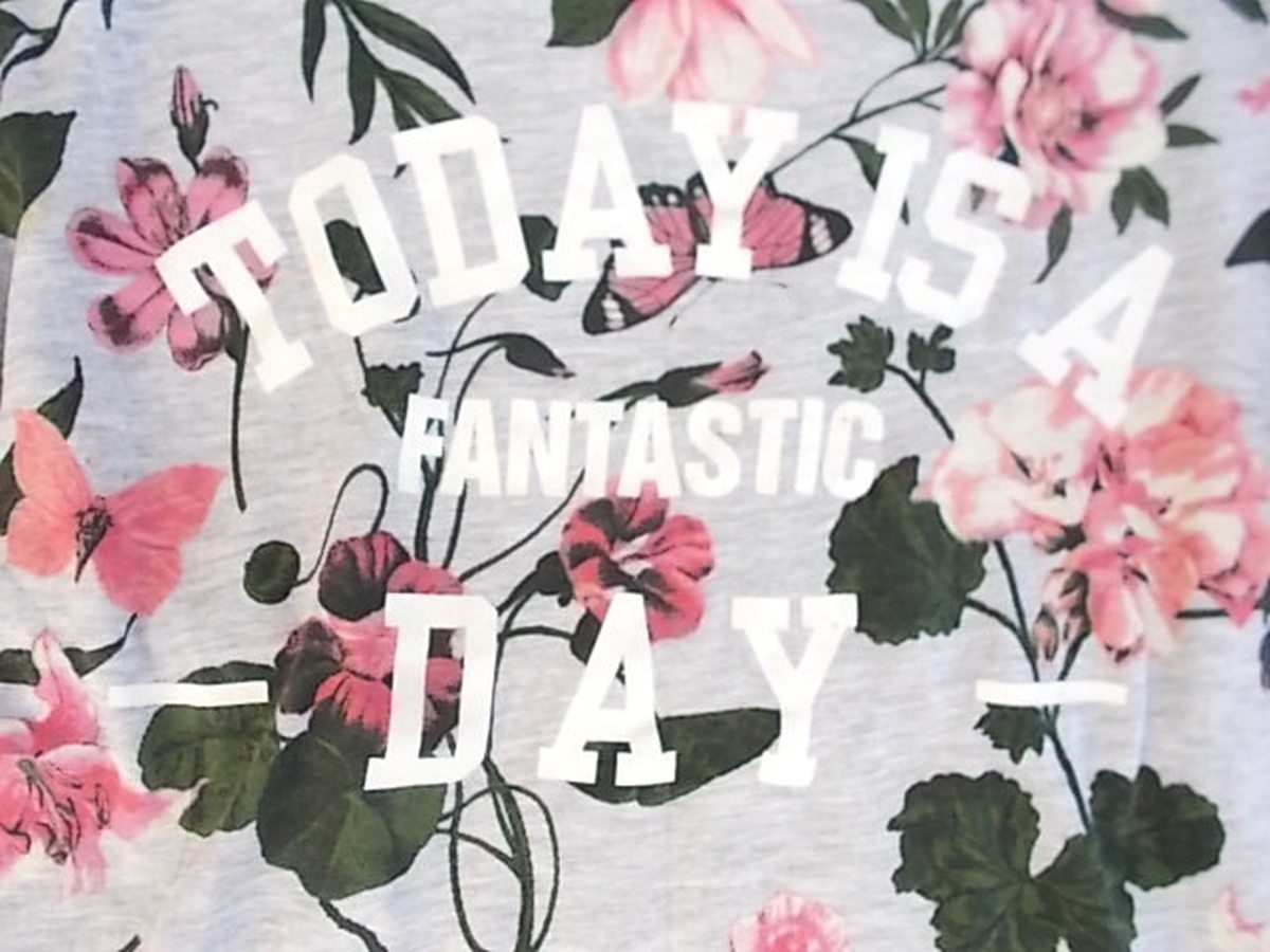 Pěkné květované tričko se třpytivým nápisem TODAY IS A FANTASTIC DAY - krátký rukáv, spodní lem do oblouku, zadní díl je delší. Příjemný materiál - 97 % bavlna a 3 % viskóza.