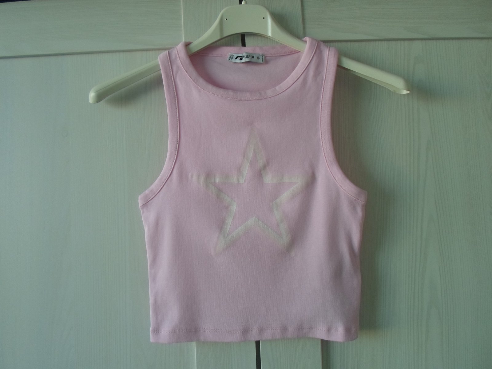 Nenošené jen vyprané. Obrázek hvězdy podle žebrování trika jakoby popraskaný, ale vypadá že to tak má asi být. Nikdy nebylo nošené jenom vyzkoušené. 95% bavlna, 5% elastan. Vel. s řekla bych že menší.