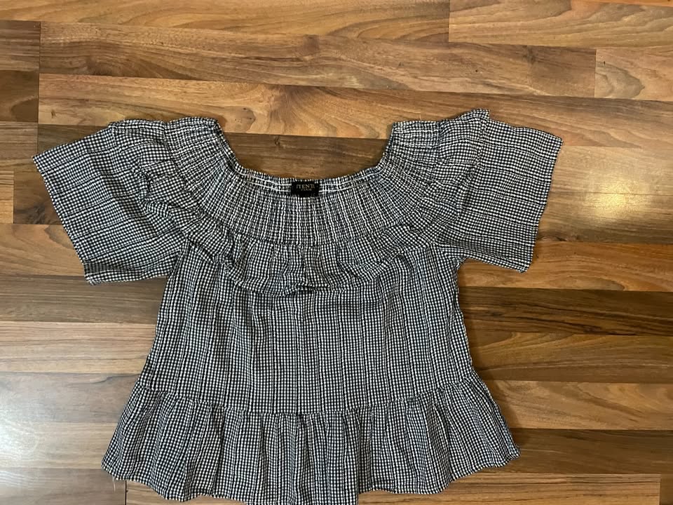 3544. krab13. nabízím k prodjei tento káro letní top s možností stažení na ramena, vel M, Attentif. Na ramena pružný rantl z gumek 40-65, délka top 49, prsa 47, pas 46. Mimo části z gumek látka nepruží. 100% bavlna, Nošen, bez vad, krásný
