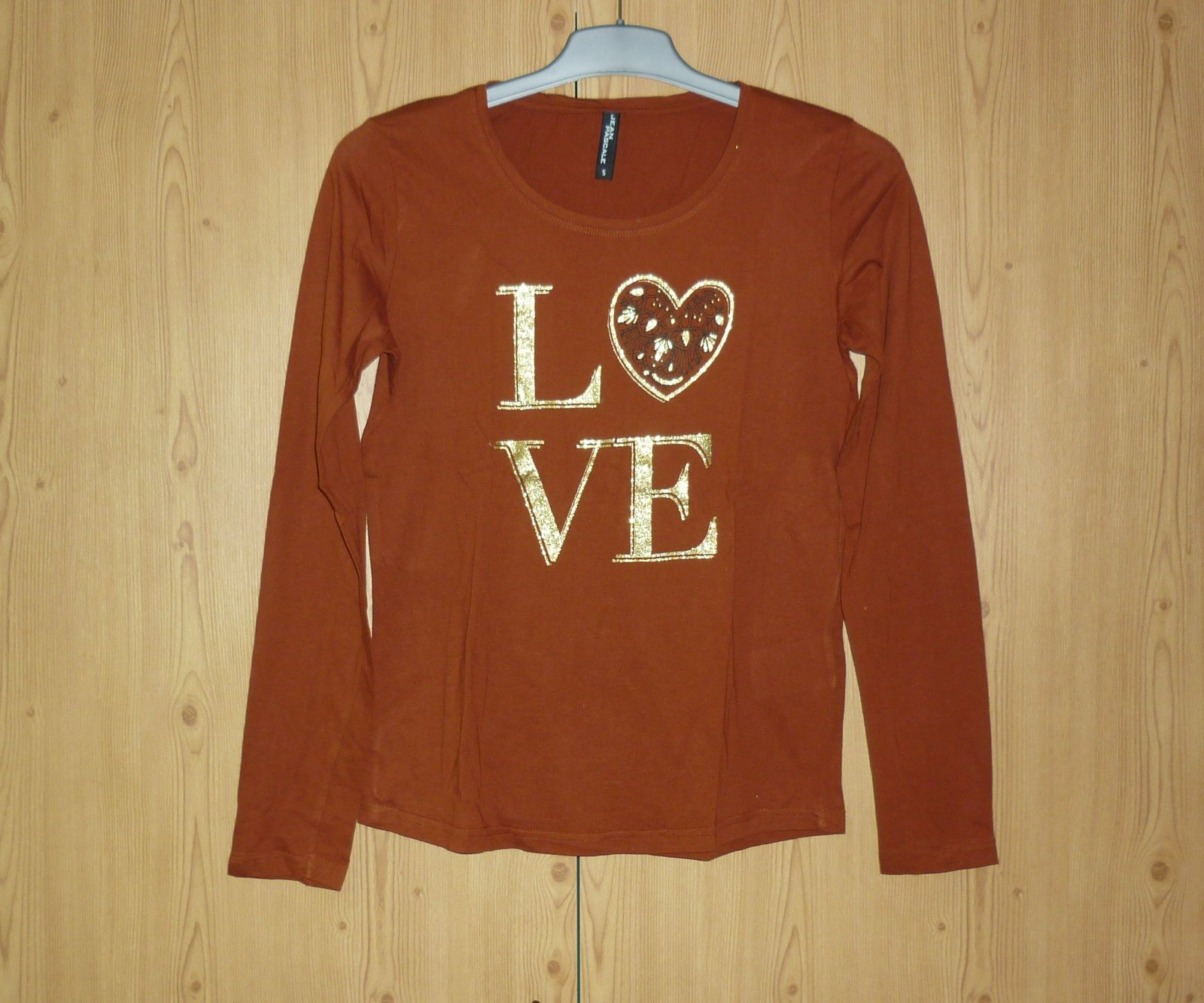 Prodám skořicově hnědé dámské tričko Takko Fashion, 2x na sobě, ve velmi dobrém stavu. Dlouhý rukáv, na předním díle zlatavý potisk. Materiál: 100% bavlna. Velikost: S. Rozměry: šířka v místě podpaží 46cm x 2, celková délka trička 63cm, délka rukávu od ramene 62cm. Cena: 30,-Kč + poštovné. Koukněte na moje další inzeráty, třeba si něco vyberete a ušetříte na poštovném. Tel.: 728 455 567
