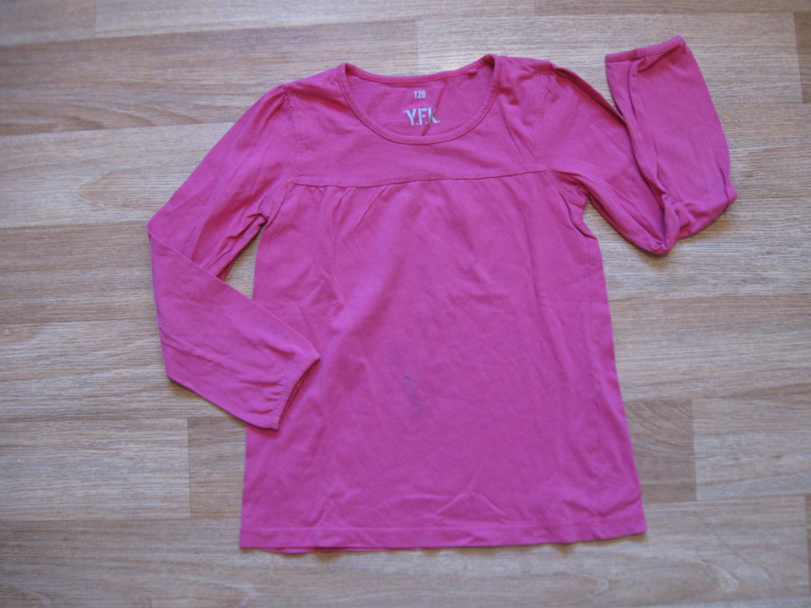 *Triko OKAIDI, vel. 7/8 let. Sytě růžové, až malinové triko dlouhý rukáv francouzské značky, materiál 93% bavlna, 7% elastan, vpředu potisk s flitříky, nepatrně prací chloupek, d. 45, š. 33cm v prů...