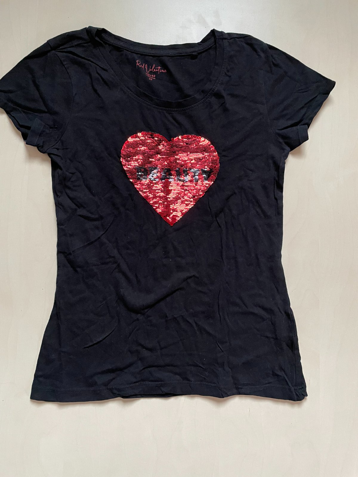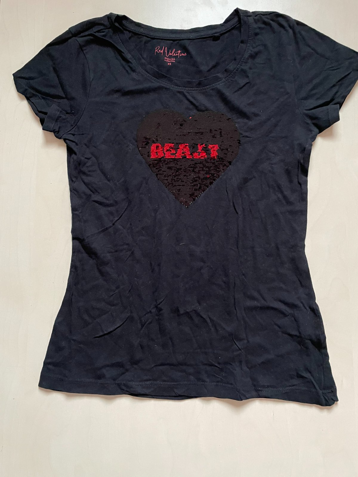 hol. nabízím k prodeji toto černé triko s nápisem na přední straně s menícími flitry, vel XS, Red Valentine. Materiál 100% bavlna. Nošené, bez avd, krásné