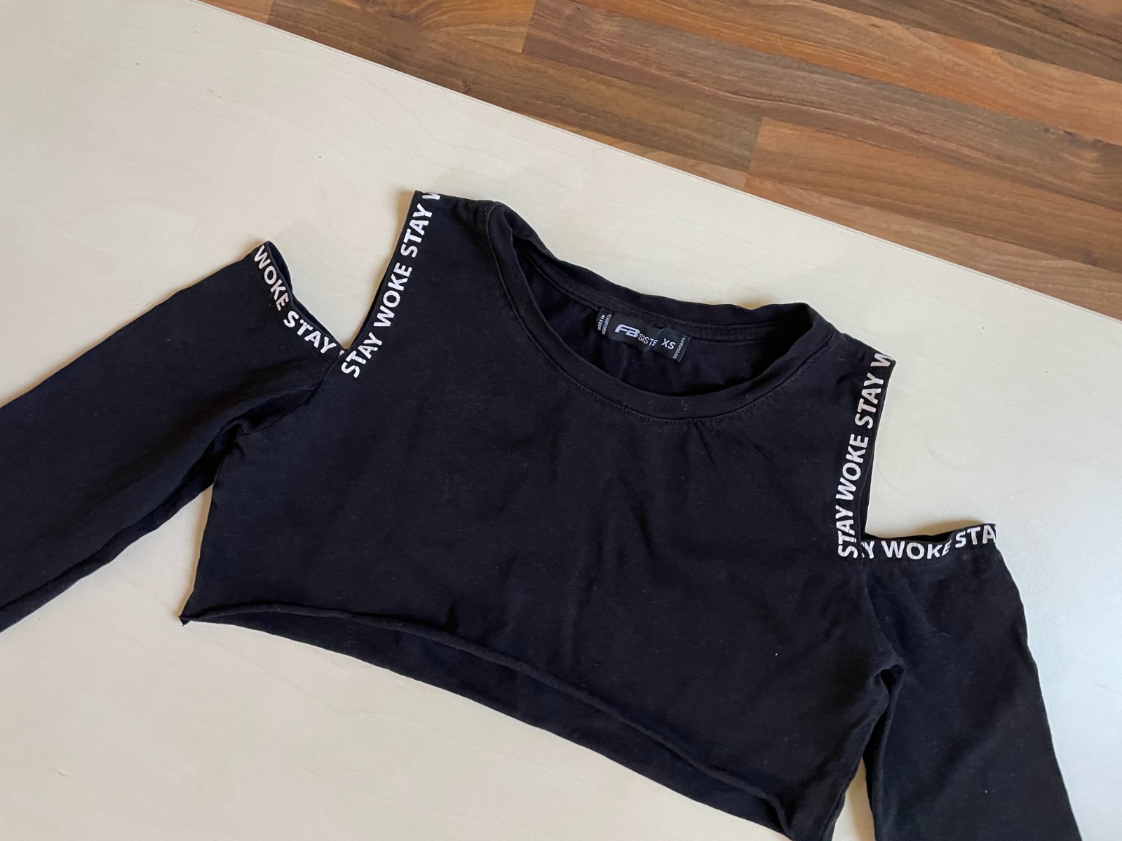 hol. nabízím k prodeji toto čertné crop triko s průstřihem na ramena, vel XS, FB Sister. Průstřihy okolo nápisy stay woke, jsou lehounce popraskané, spíše dáno tou technikou, top nebyl nošen moc. Nijak myslím neruší, černá sytá.