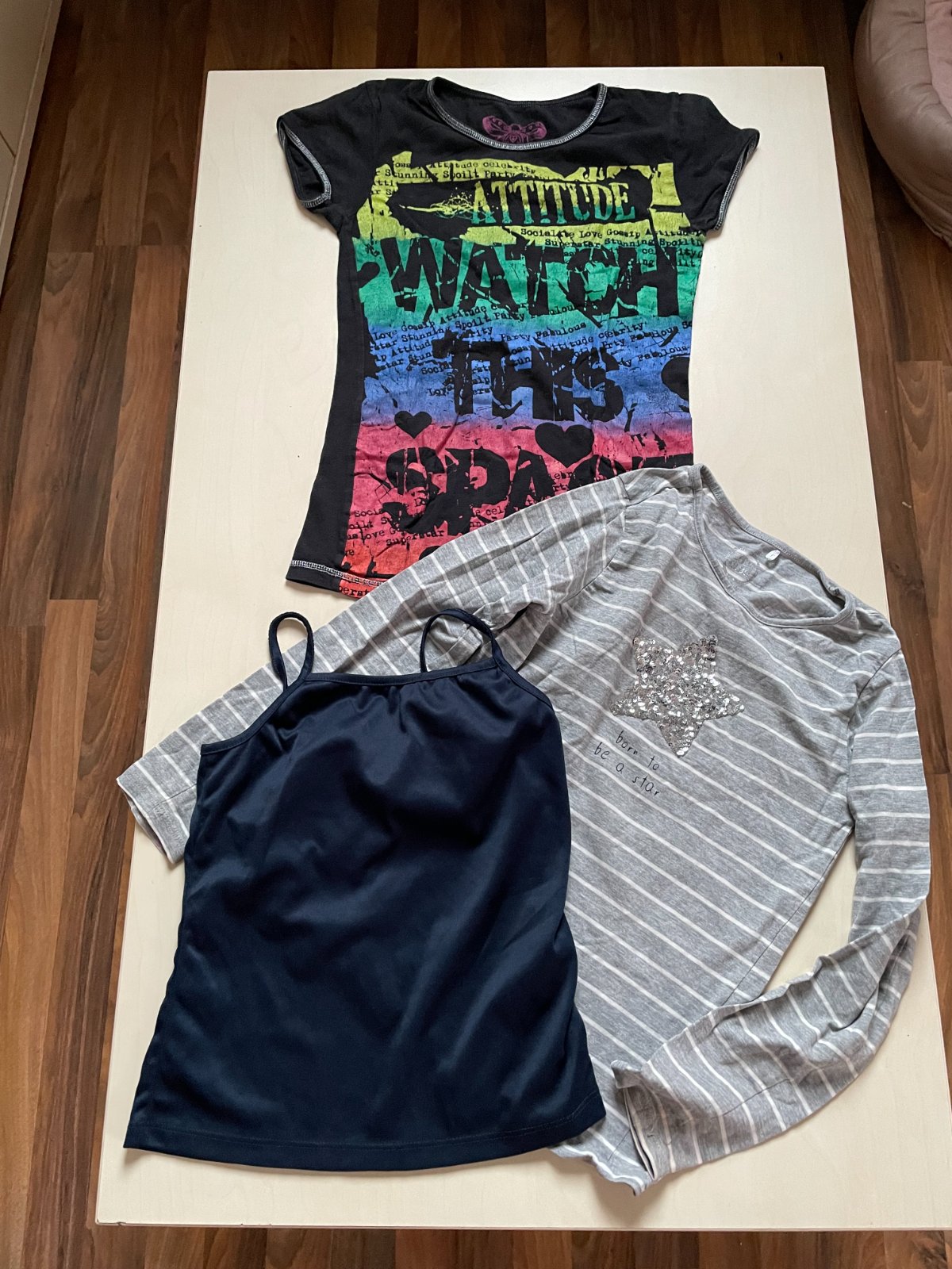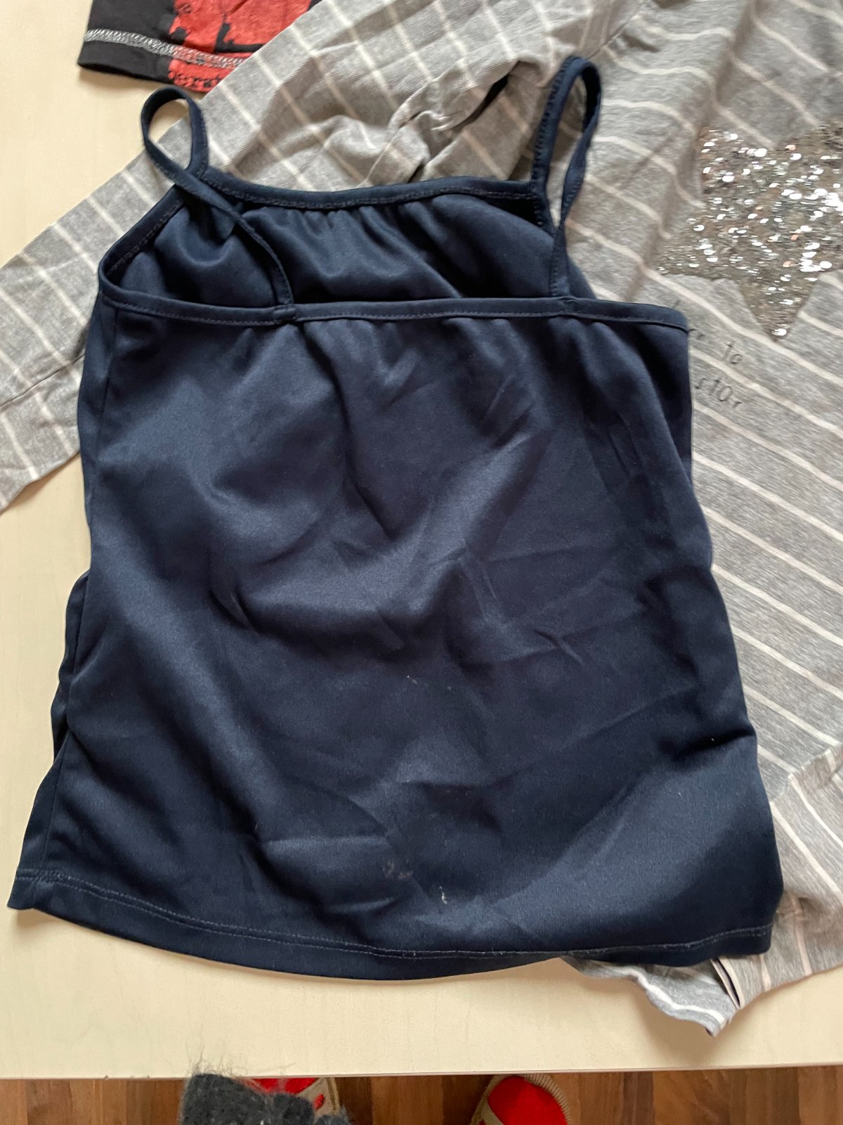 hol. nabízím k prodeji triko s topiskem (délka 54, šíře34-38) a tmavě modré tílko (délka 42, prsa 32-40), obojí velikost 152, 11-12 let. K tomu navíc šedé proužkované - má zadní strany rukávů zabarvené.To je velikost 146 cool club (délka 49, prsa 34-40).
