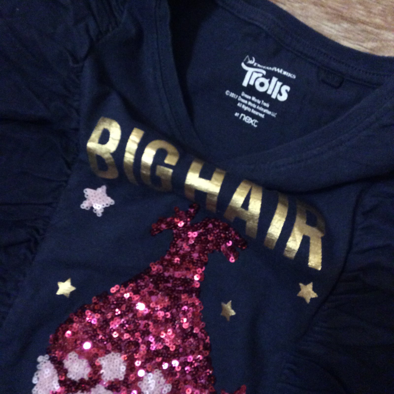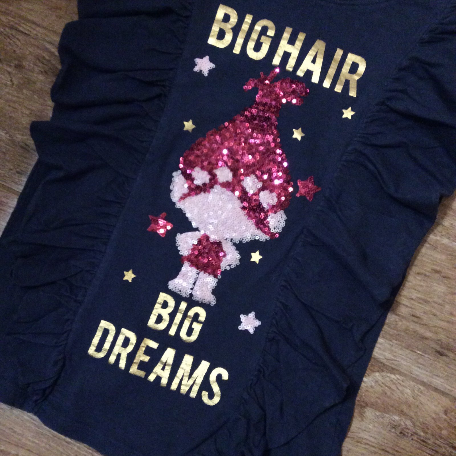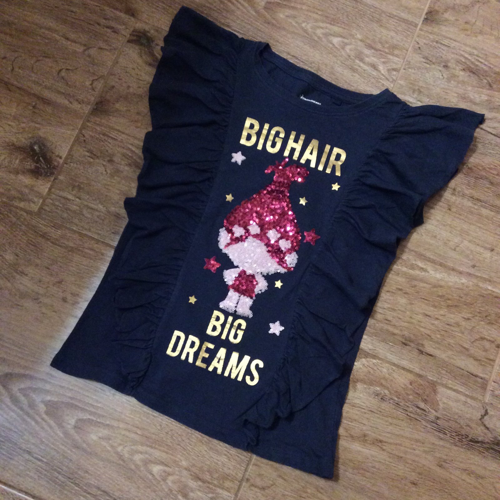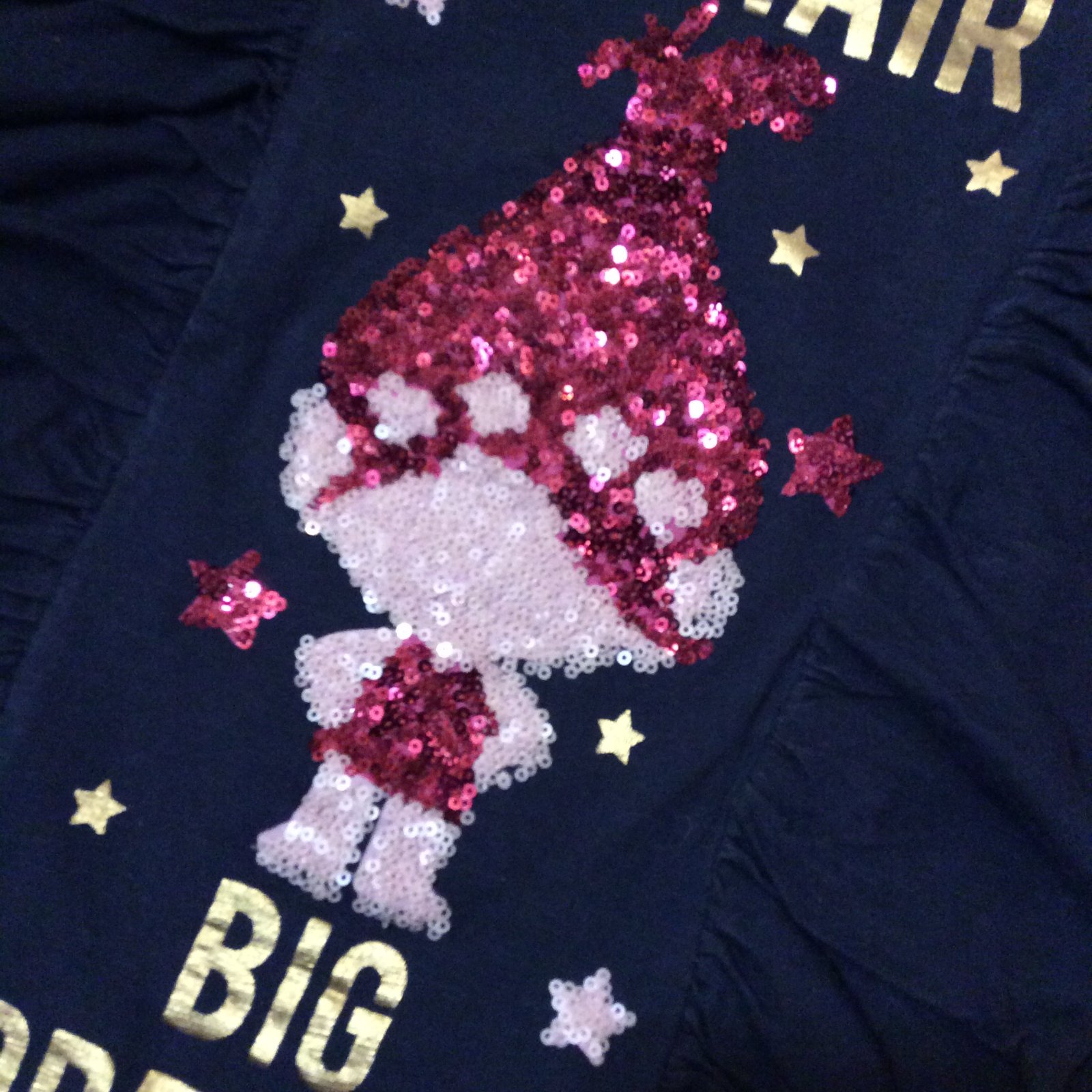- krásné nošené bavlněné tričko ,,TROLLS" zdobené volánky, flitry a zlatým nápisem