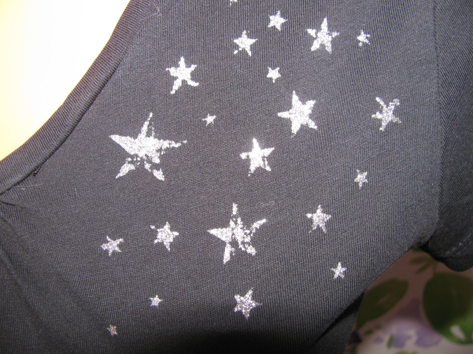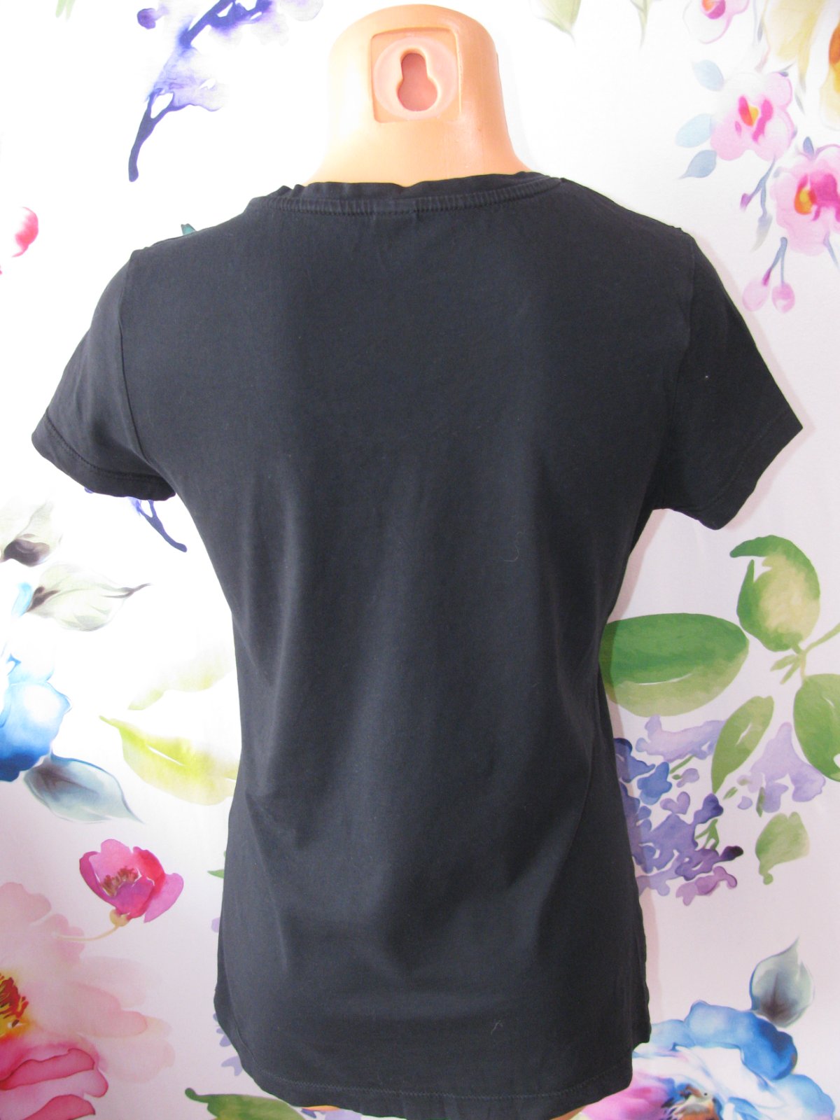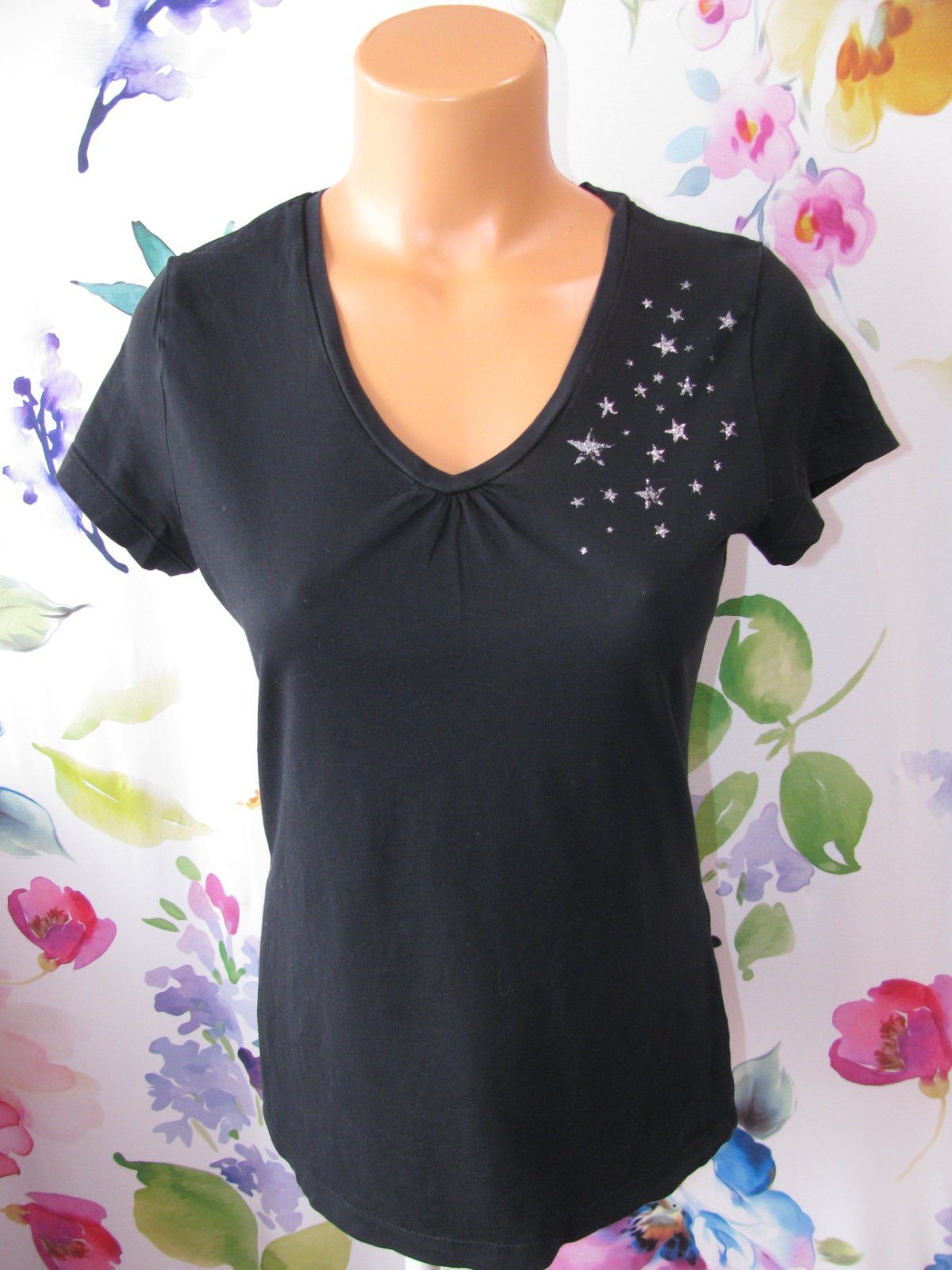 Hezké černé pružné tričko, zdobené stříbrnými hvězdičkami, vyšité logo, bavlna s podílem elastanu, štítek stran materiálu ustřižen. Některé hvězdičky lehce odřené-viz foto, jinak krásný stav bez vady.