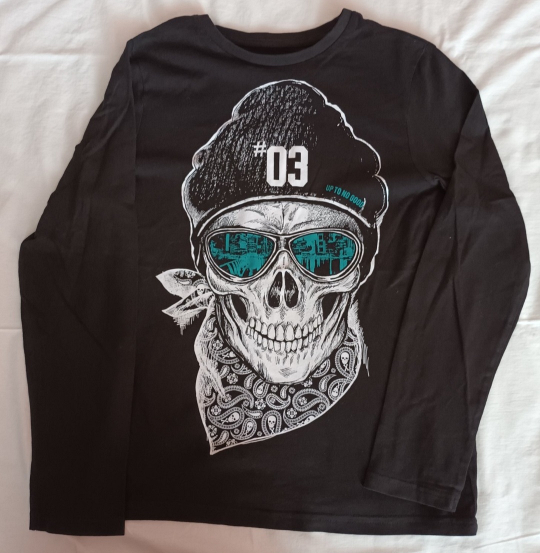 Černé chlapecké triko s lebkou dlouhý rukáv C&A, vel. 158/164. Triko je nenošené - nové , zapomenuté ve skříni.