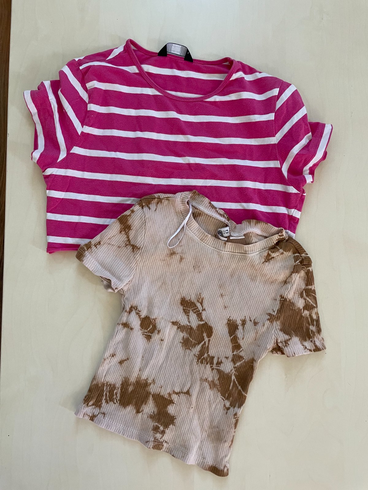 hol. nabízím k prodeji tento set 2 ks crop topů, vel obojí 34 tedy XS. Béžové batikované, je žebrované, pružící, Délka od ramene 38, prsa 25-40. Růžový pruh je délka od ramene 33, prsa 41-55