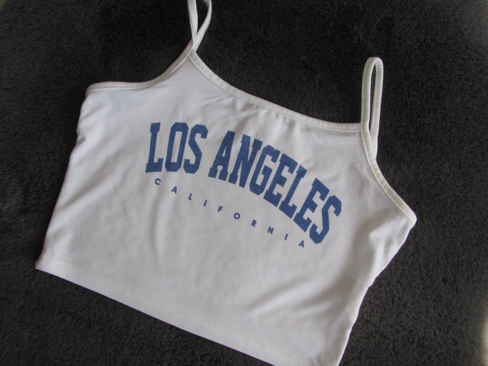 Skvělé pružné bílé Crop top tričko s nápisem, 94% polyester, 6% elastan. Dále 94% viskoza, 6% elastan.