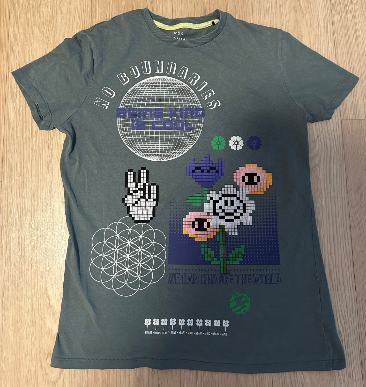 Pohodlné bavlněné tričko, velikost 164, batikované s potiskem, roztržený rukáv se záplatou, zašité - viz fotka, zohledněno v ceně, PC 590,-