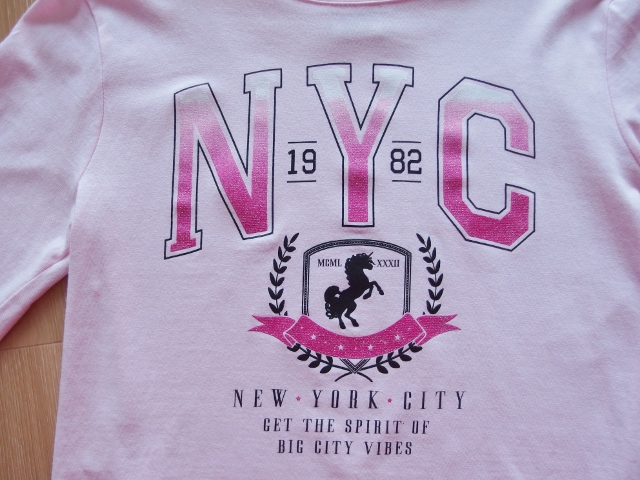 Prodám tričko dlouhý rukáv kupované v obchodě Takko zn. Page One Young. Velikost je uvedená 146-152 (odpovídá spíše na 12 let - měřte). Tričko je v top stavu, povrch trička vzhledově jako nový. Dcerka měla max. 5x na sobě. Nápis NYC (= New York City) a růžový potisk pod koněm se třpytí.