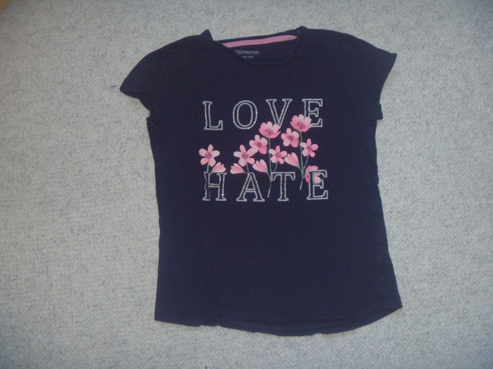 Prodám dívčí tmavě modré tričko s krátkým rukávem, s kytičkami a nápisem, značka Destination, velikost 158/164, dobrý stav.