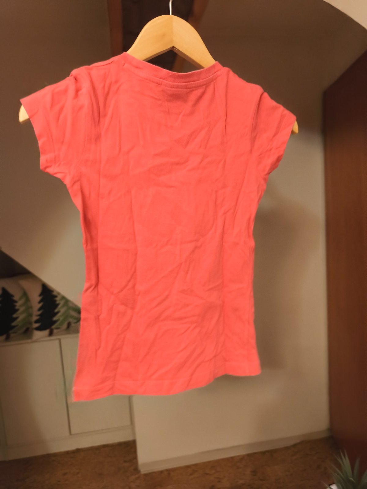 Červeno - růžové - jahodové tričko Roxy 10, pro štíhlou holčičku, nositelné i dřív. Běžné známky praní, prací chloupek, trochu popraskaný potisk. Na fotce přesvícené.