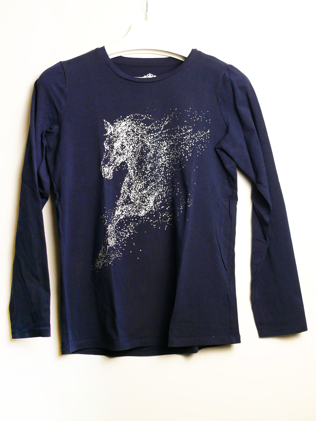 Prodám tmavě modré tričko se stříbrným potiskem koně, velikost 158/164, TOP stav.