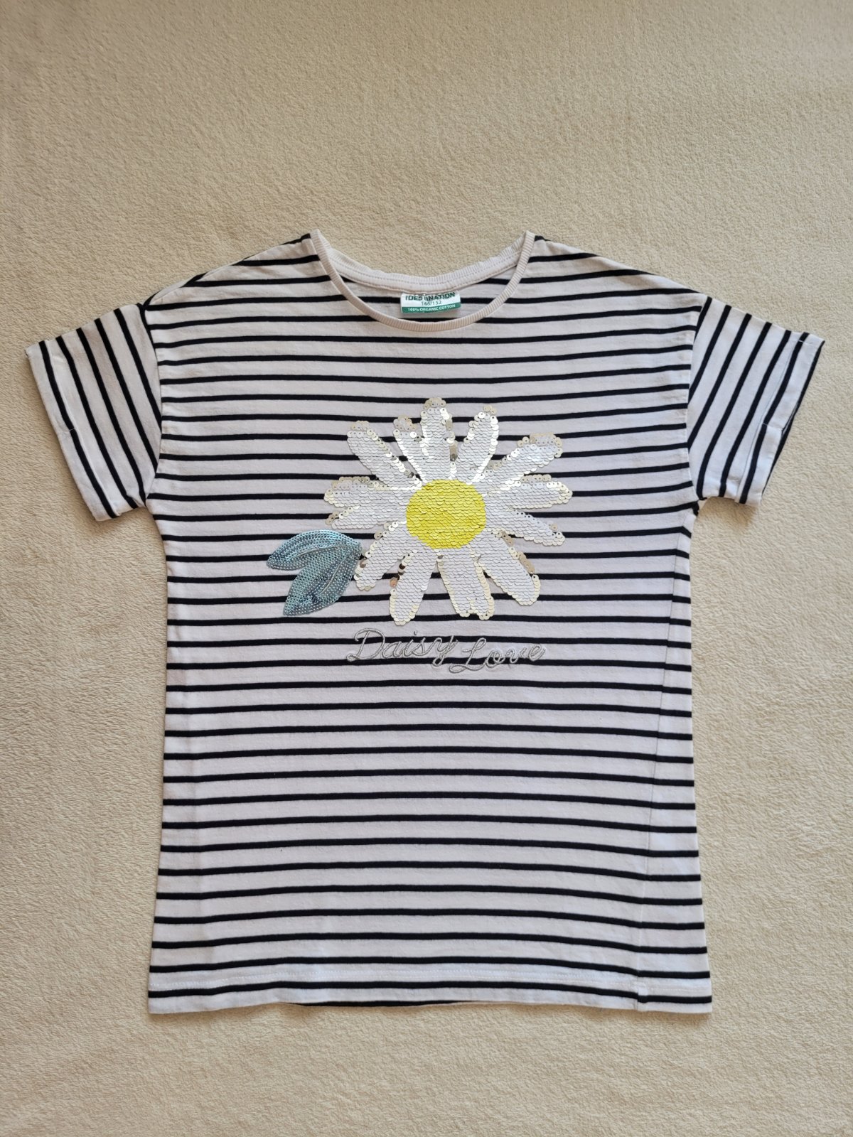 Bavlněné (z organické bavlny) tričko s krátkým rukávem značky Destination v bílé barvě s tm. modrými proužky a obrázkem kopretiny z flitrů. Na dotek moc příjemné.