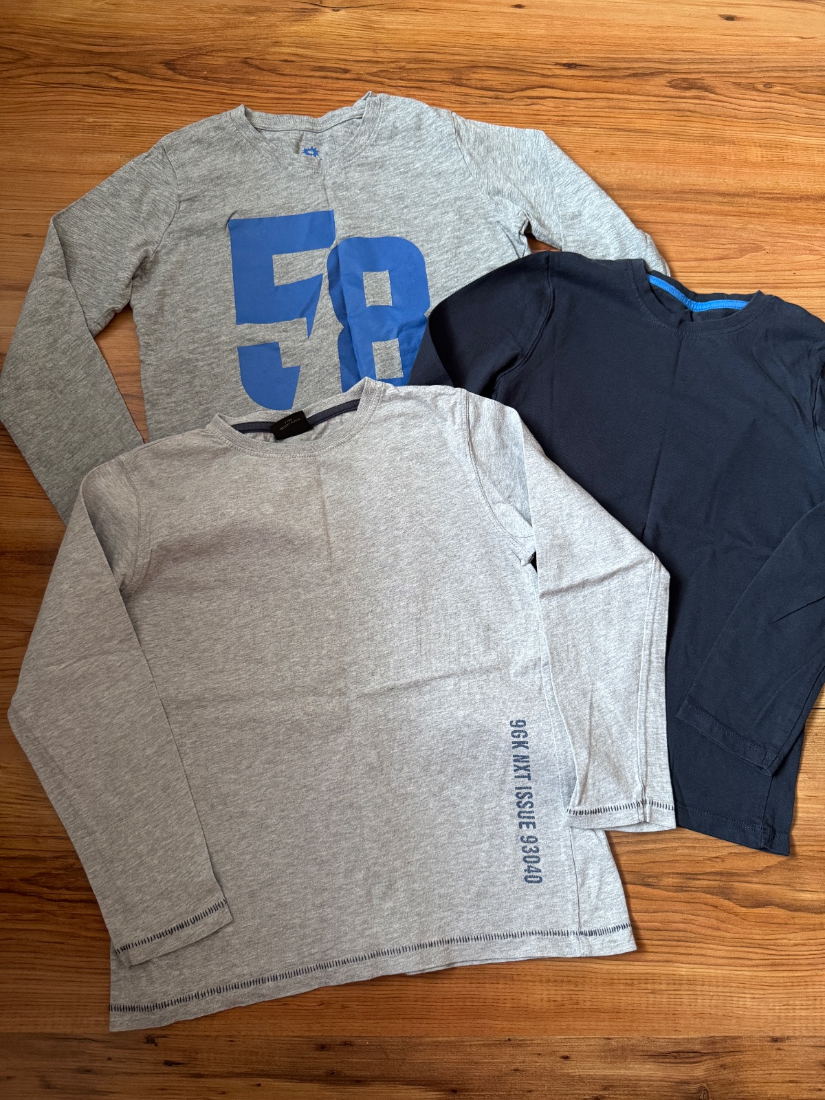 - 3x chlapecká trička s dlouhým rukávem - prodávám jako komplet, nerozděluji - velikosti odpovídají vel.134 - 1x barva bílá, 1x světle modrá - potisk pracovních strojů, 1x světle šedá - potisk auta...