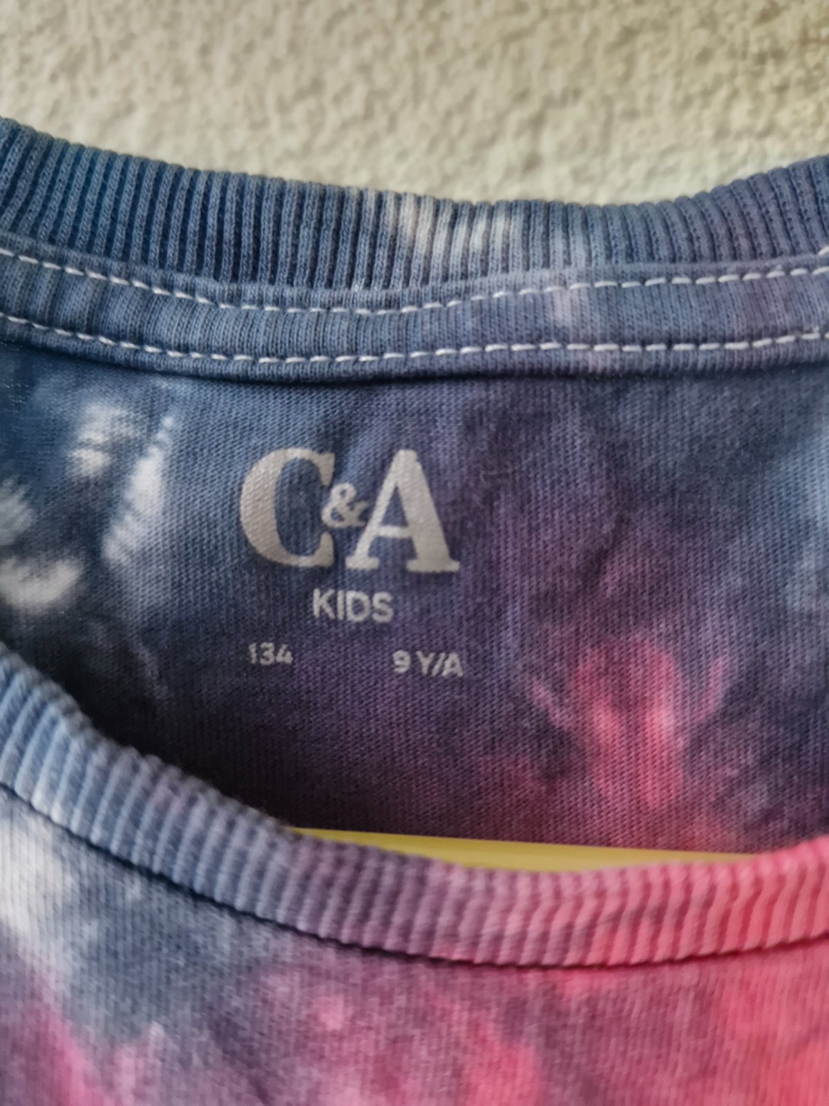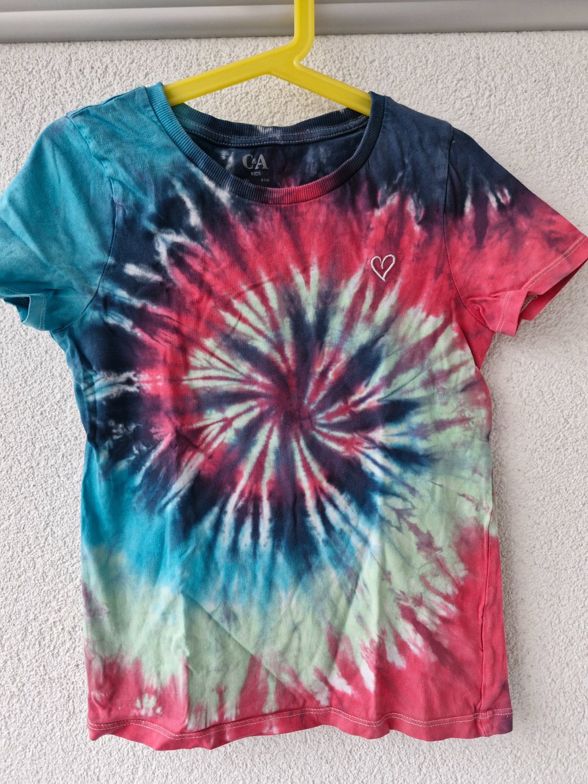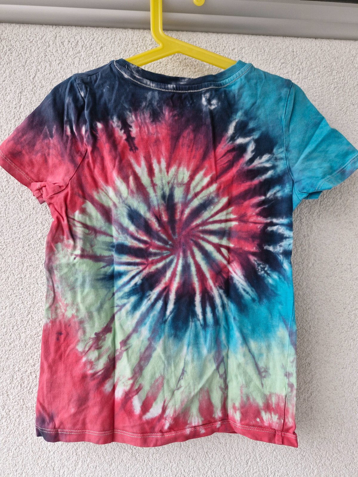 Tričko původně C&A (uvedená velikost 134 - 9 let) bílé barvy. Děti ho batikovali reaktivními barvami, takže naprostý originál. Po batikování již bylo mnohokrát prané, takže barvy už jsou ustálené a neblednou a nebarví.
