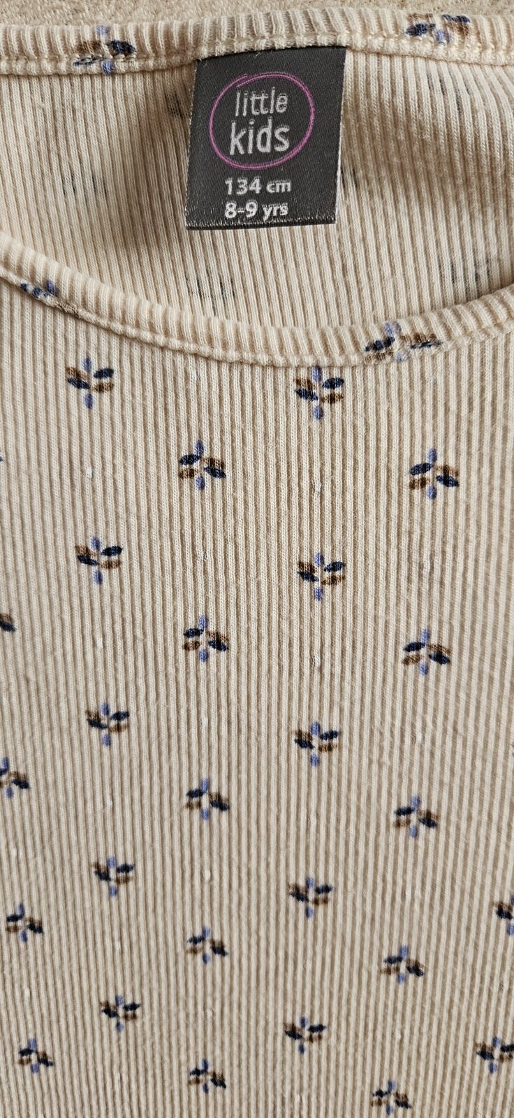 Barva béžová, materiál příjemný, vroubkovaný, 95% bavlna, 5% elastan, lemy rukávků a spodní lem jsou ozdobné.