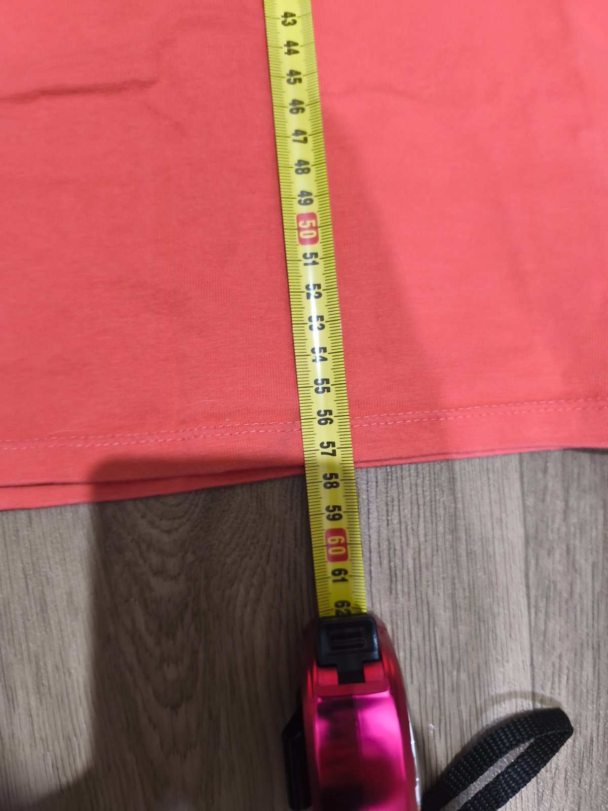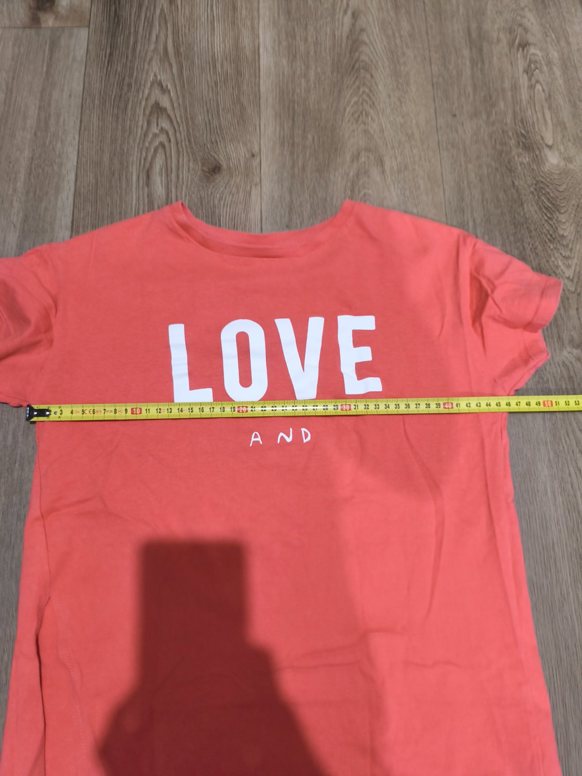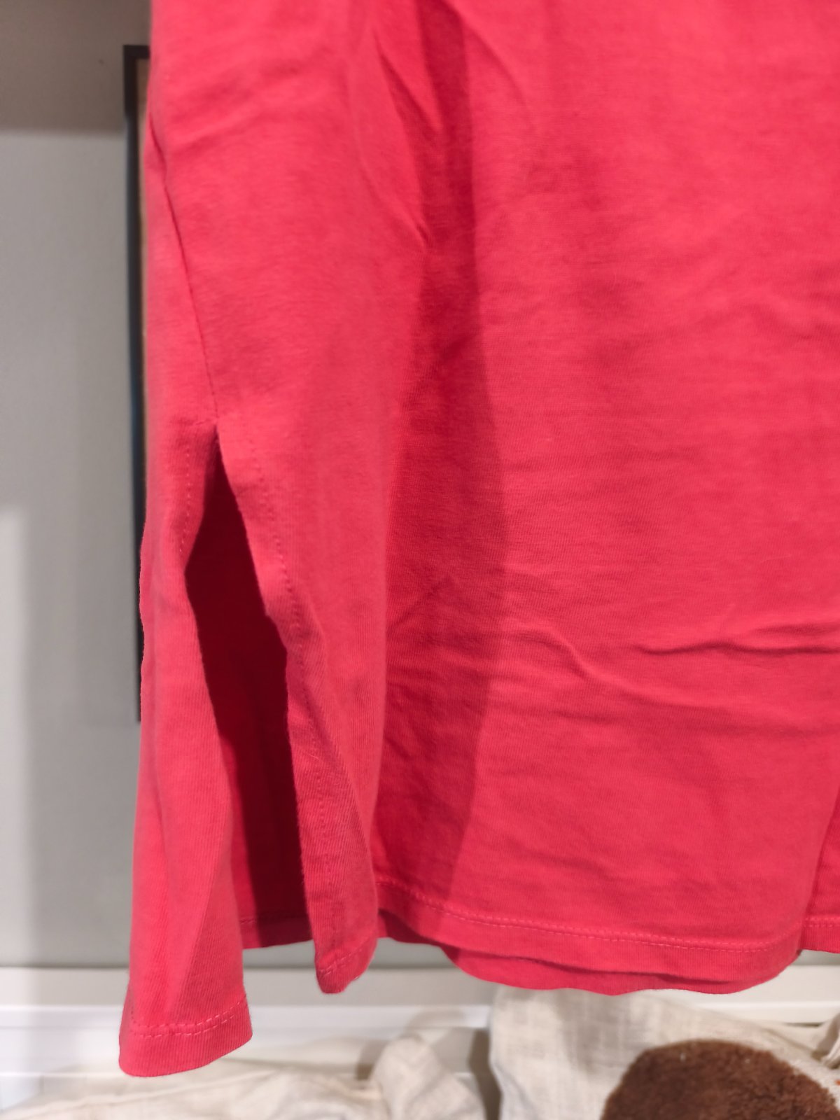 Světle červené tričko s rozparkem vel.140, je maxi, vhodné až do 164 nebo XS-M. Běžné známky praní, vzadu malý flíček.