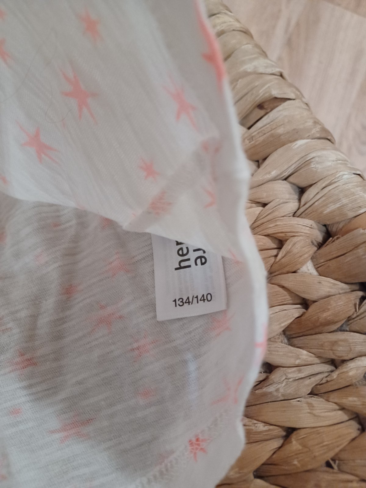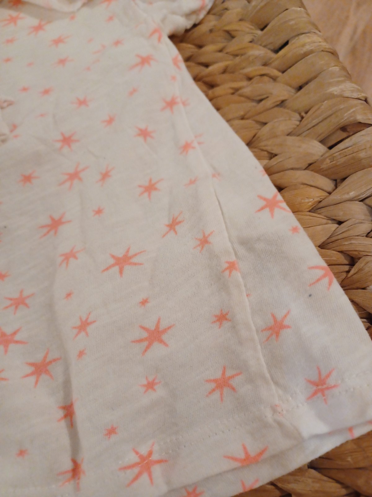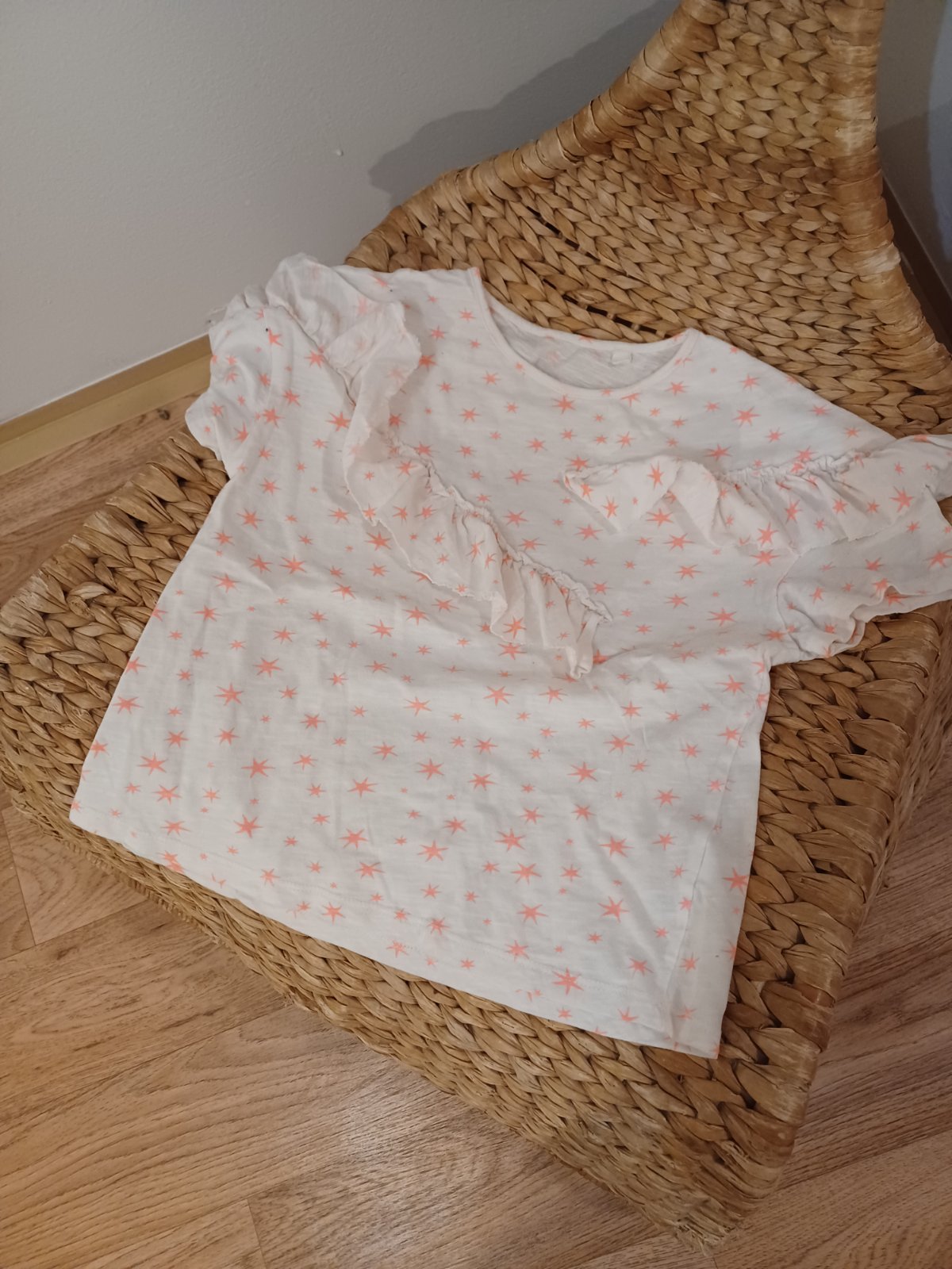 Pěkné nošené široké tričko s volánky a hvězdičkami 134/140. Neon hvězdy, nešlo nafotit.