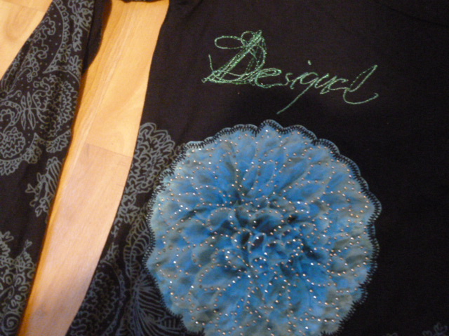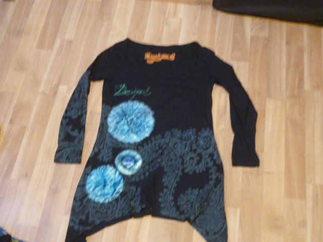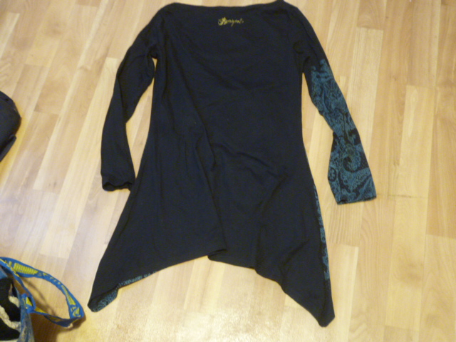 nošená, pěkná, délka na boku je 88 cm, rukáv od krku je 63 cm, průramky 2x47 cm, barva modrá, bavlna, psaná vel.L zn. Desigual