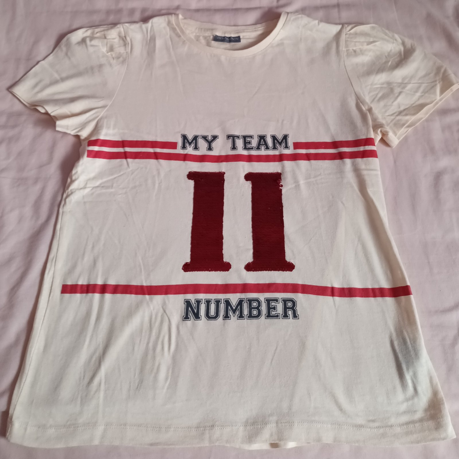 Dívčí triko krémové/béžové krátký rukáv(flitry) Destination, vel. 170. Triko je nenošené - nové.