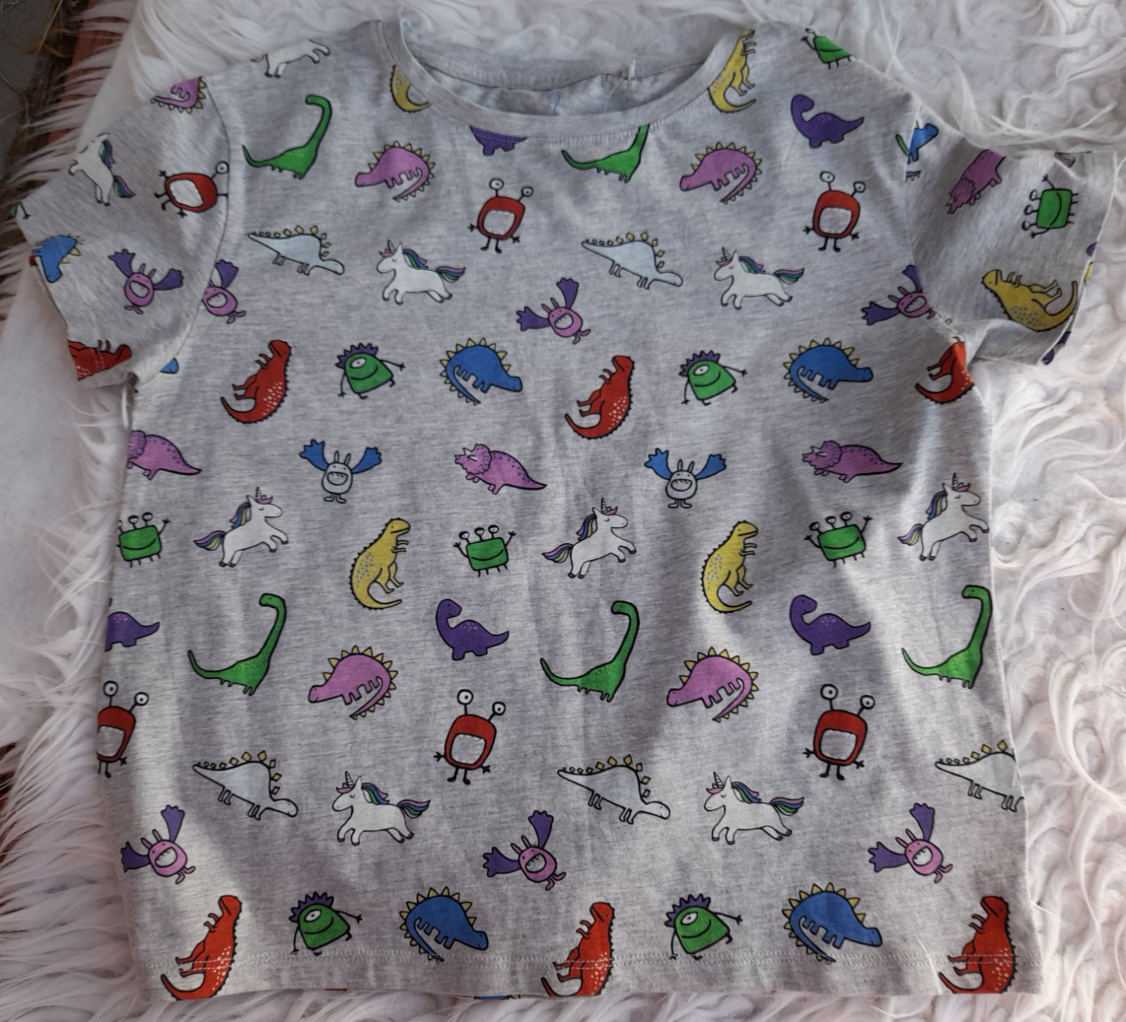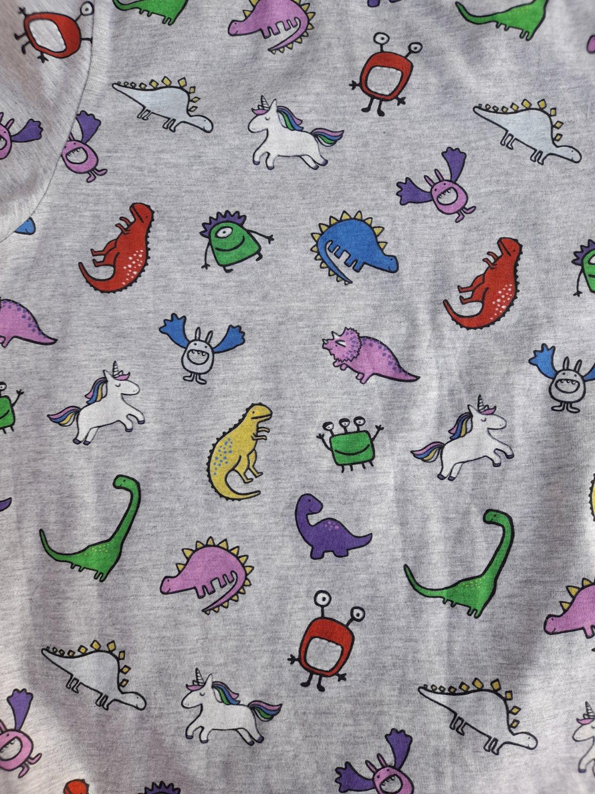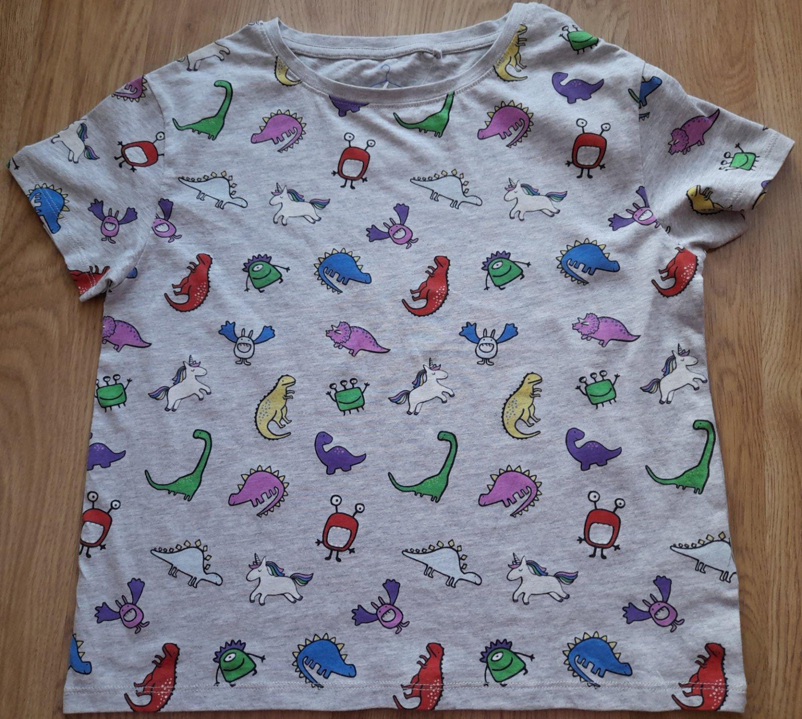 Krátce nošené tričko s obrázky a pružnými lemy kolem krku a rukávů. Rozměry: délka 52 cm, šířka 38 cm