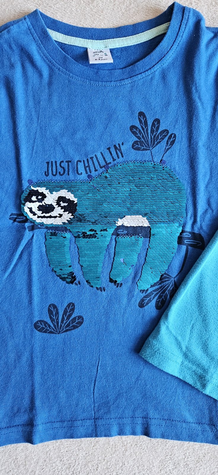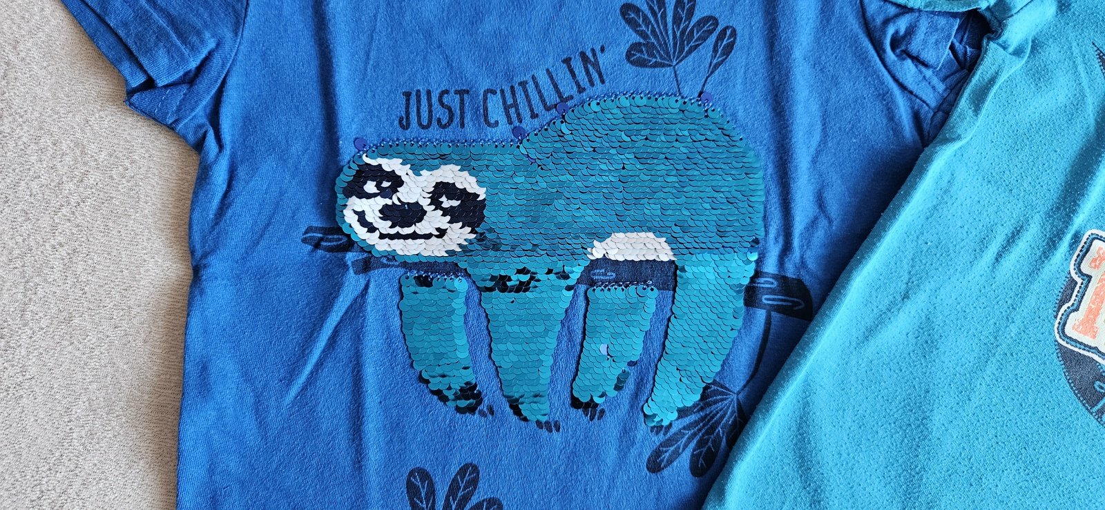 Jedno s měnícími flitry, obrázek Lenochoda (zn.Kiki&Koko, ale kupované v Německu), oblečeno jen na školkovou akci, takže jako nové, a druhé tričko s dinosaurem, obrázek neponičení, je o trošičku větší, tak 116.