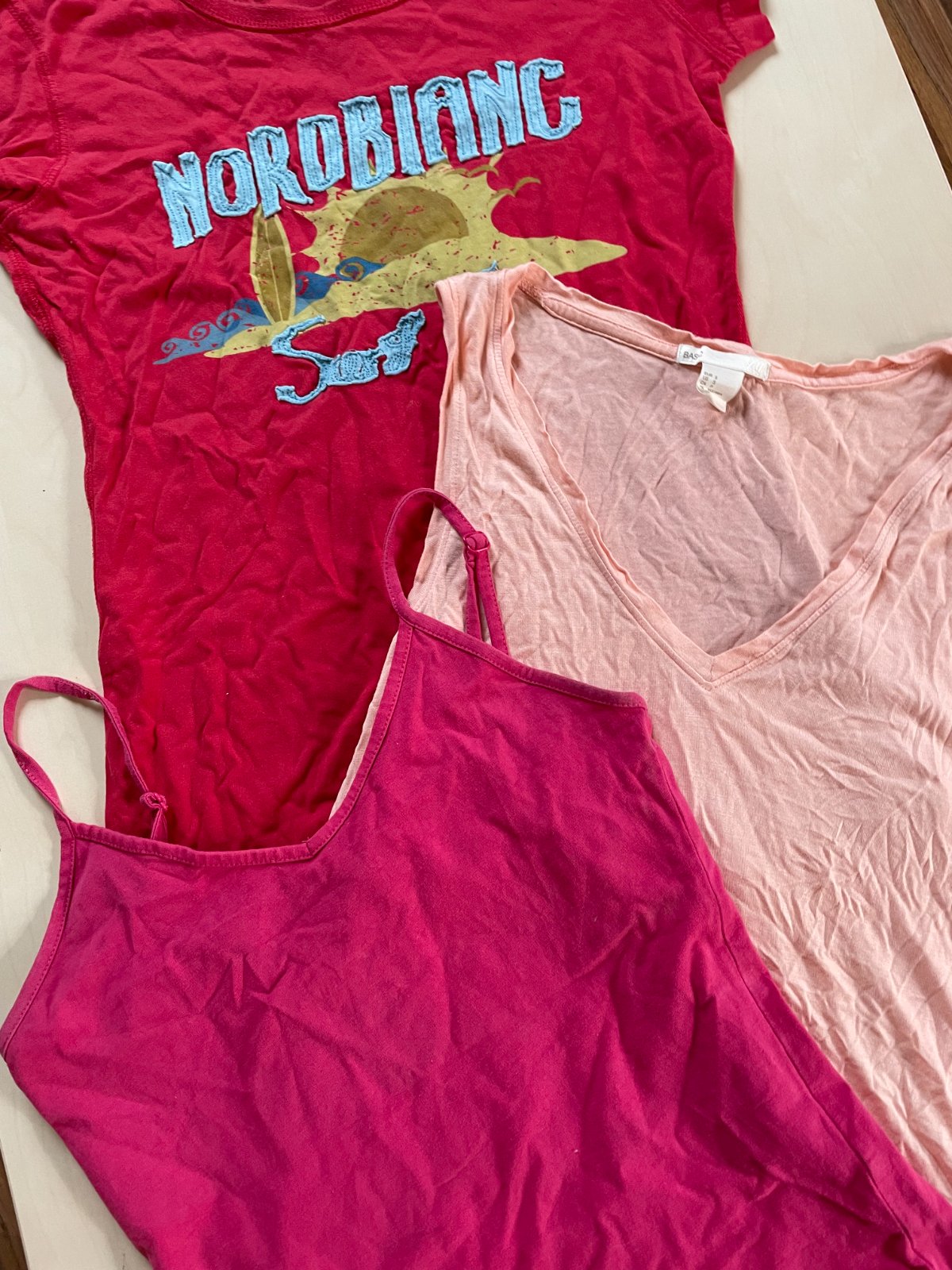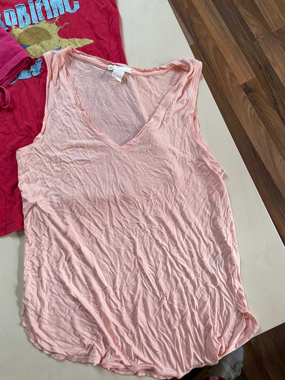1. Lososvé tílko - vel S, HM, 100% viscoza, délka 58-64, prsa 46-58.