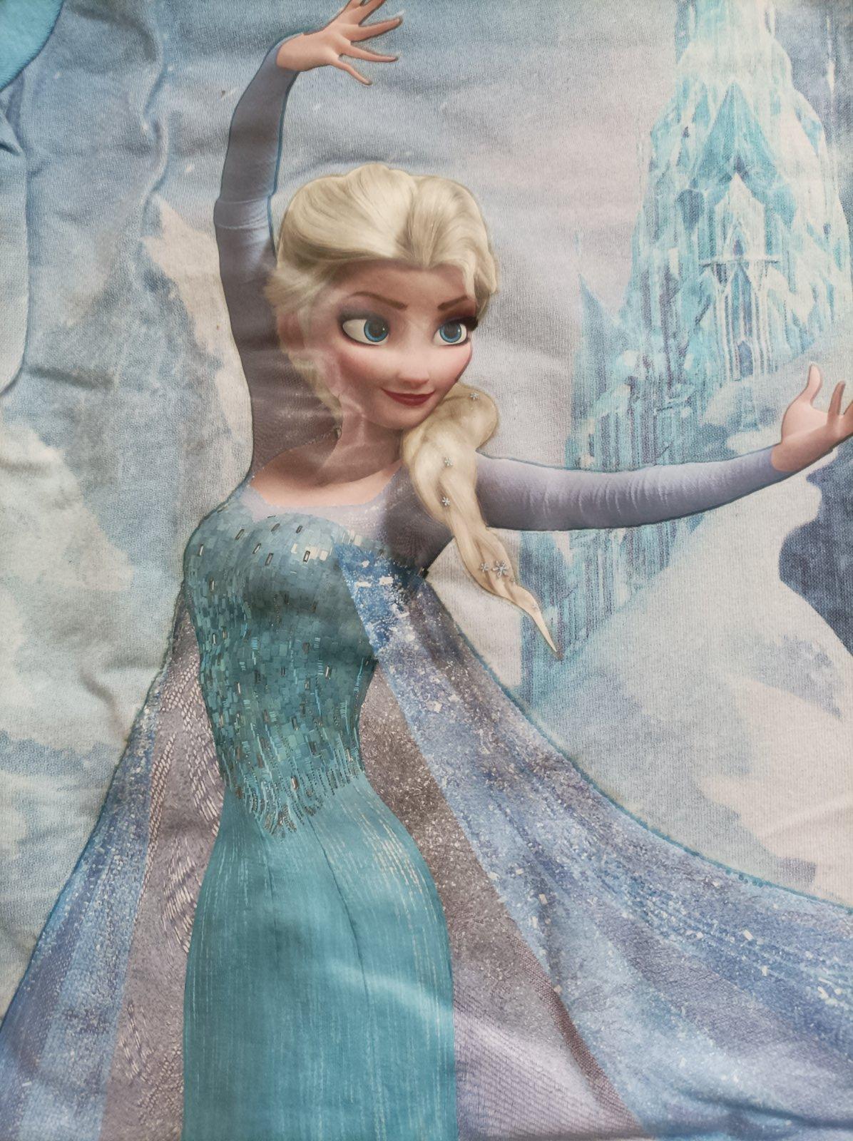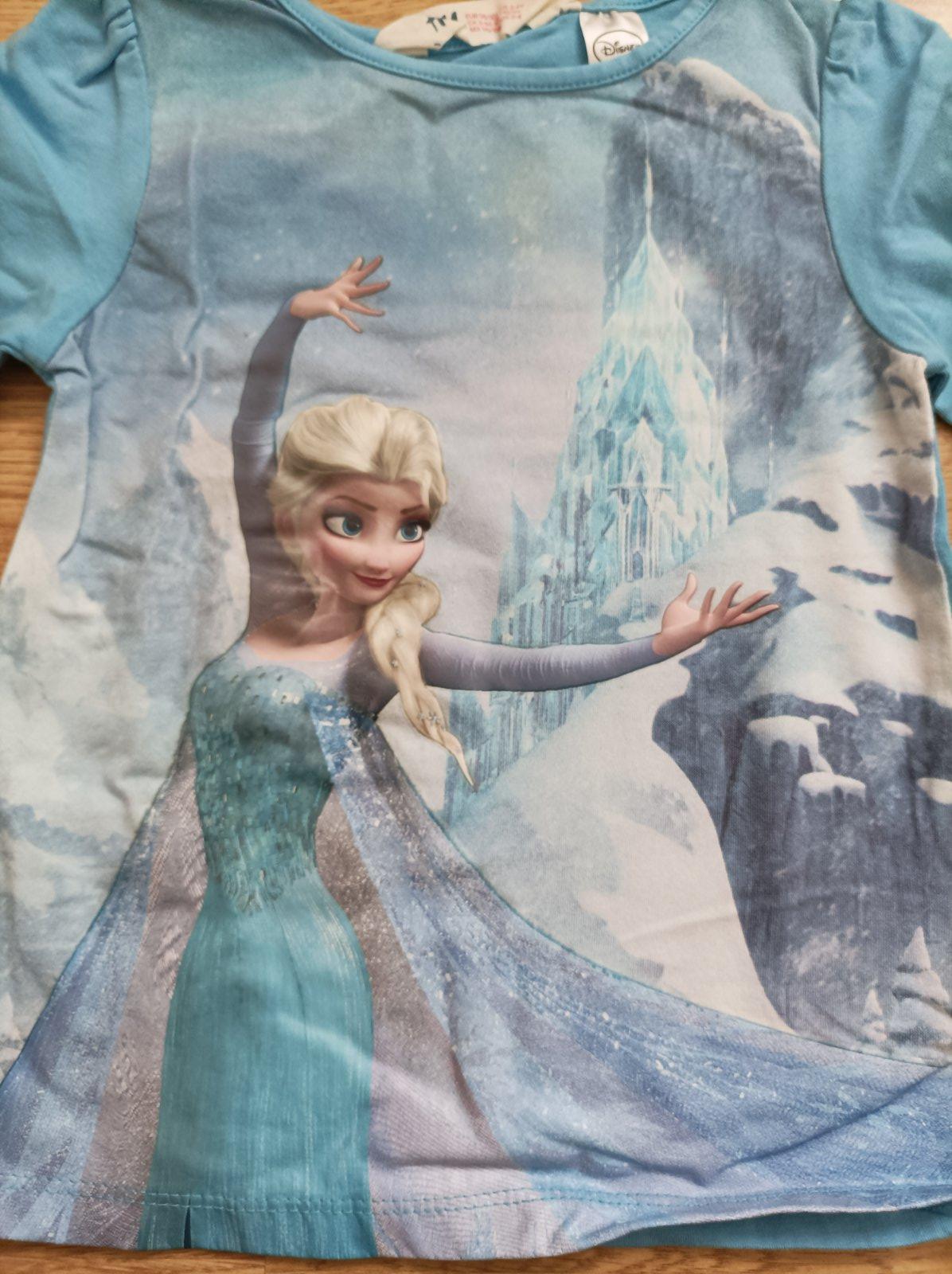Světle modré tričko Frozen s Elsou, s dlouhým rukávem. Bylo koupeno nové, je nošené v pěkném stavu, uvedená velikost 98/104.