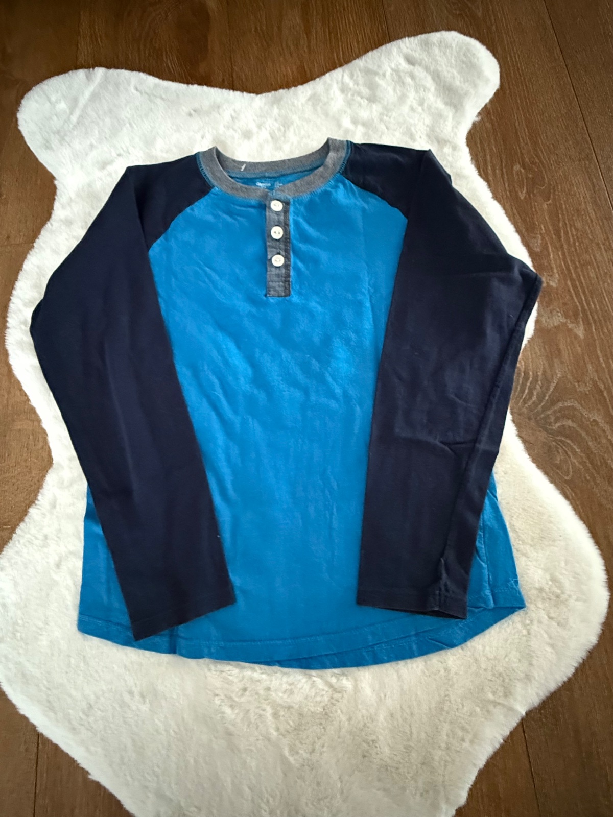 Hezký bavlněný roláček je bez vad jen jemný prací chloupek.Barva modrá s bílím žíháním.Velikost uvedená 10 let celková délka je 52 cm,rukáv měřeno od krku je 52 cm.