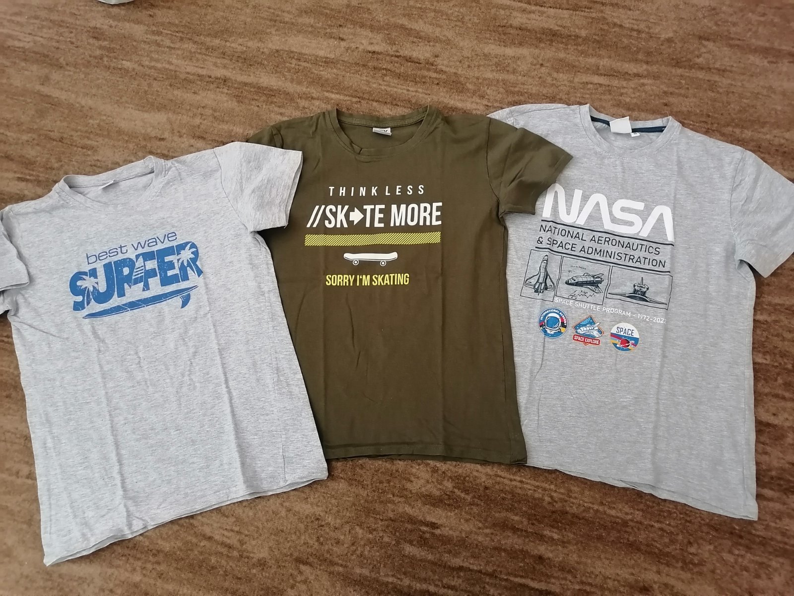3x bavlněné triko. Délka Surfer 59 cm, khaki 58 cm, Nasa 60 cm, šířka Surfer 43,5 cm, khaki 44,5 cm, Nasa 45 cm. Cena celkem.