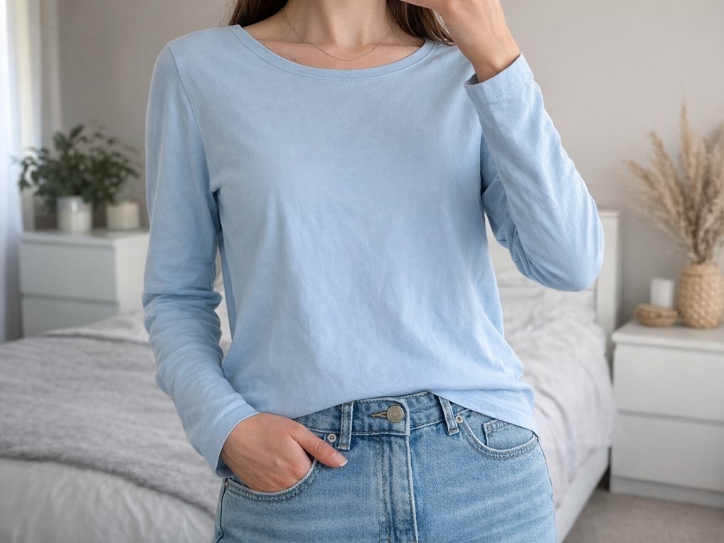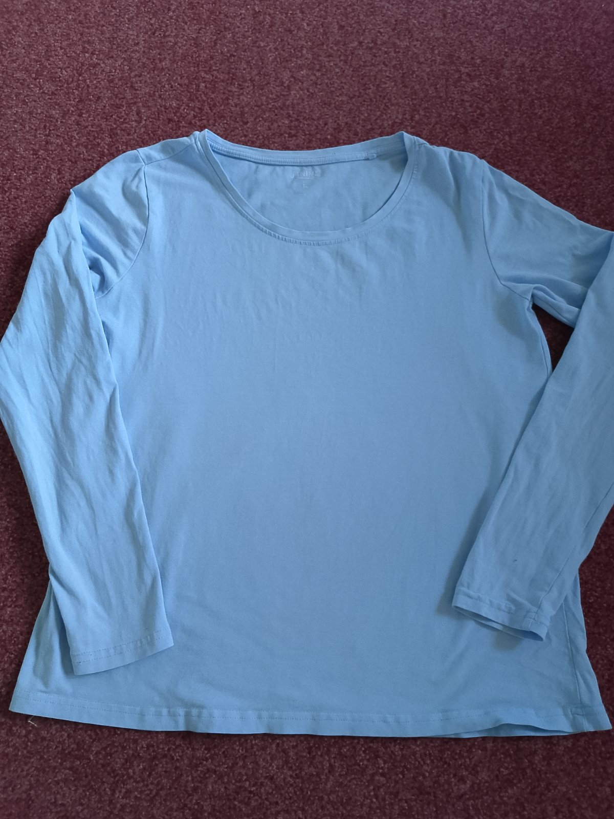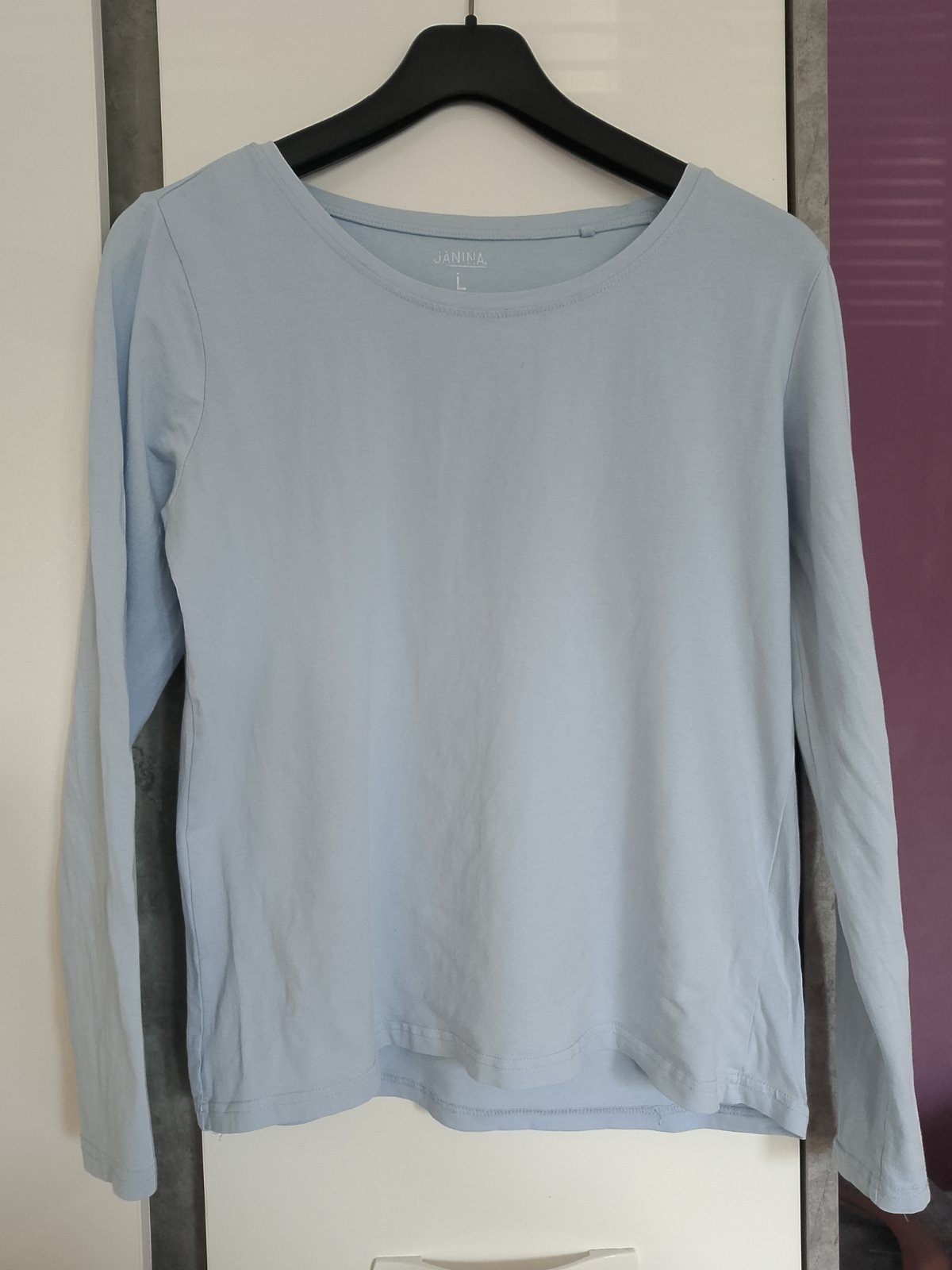 Prodám příjemné světle modré tričko s dlouhým rukávem značky Janina. Tričko má klasický kulatý výstřih a je v dobrém stavu, ideální jako základní kousek do šatníku.