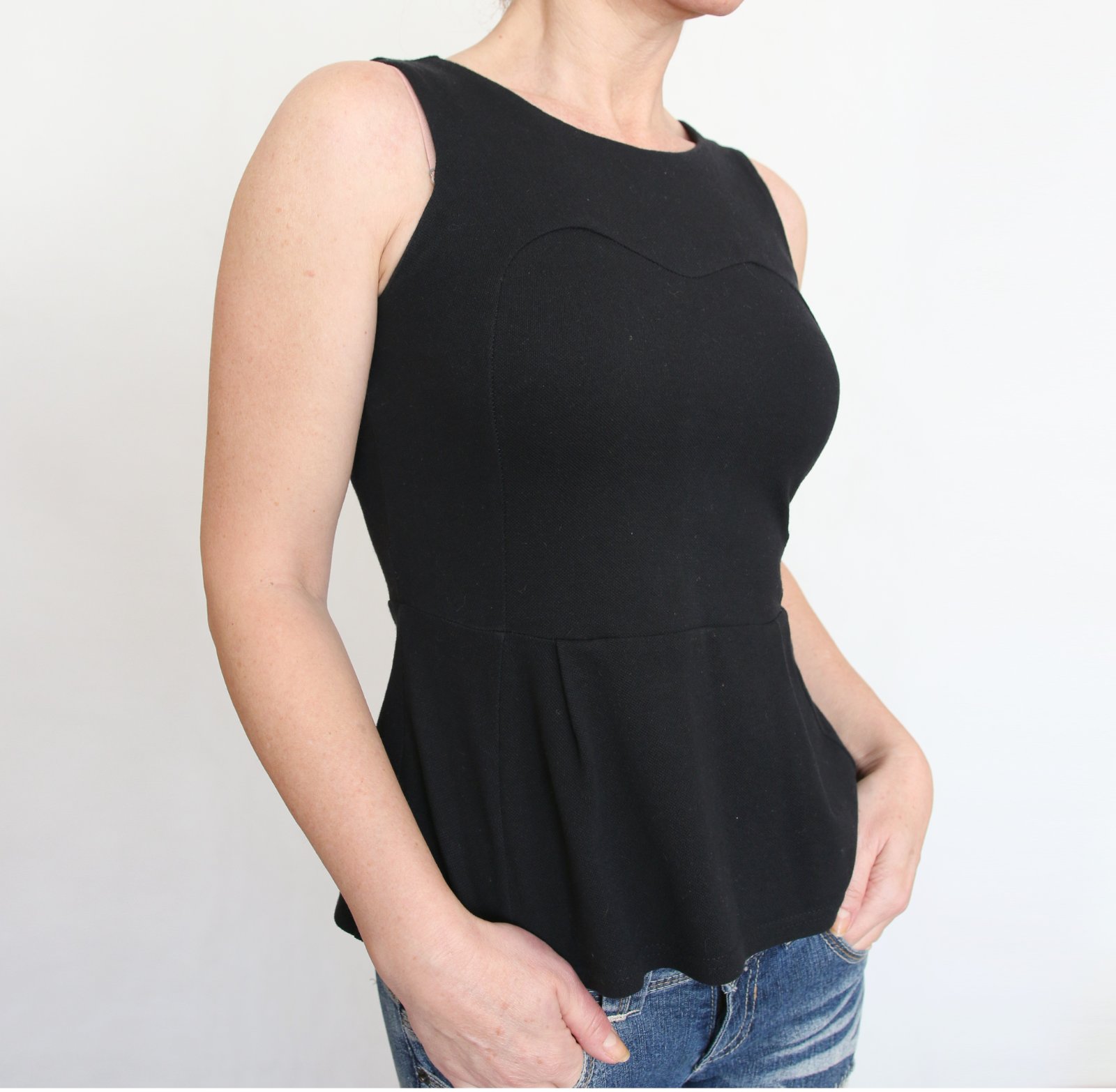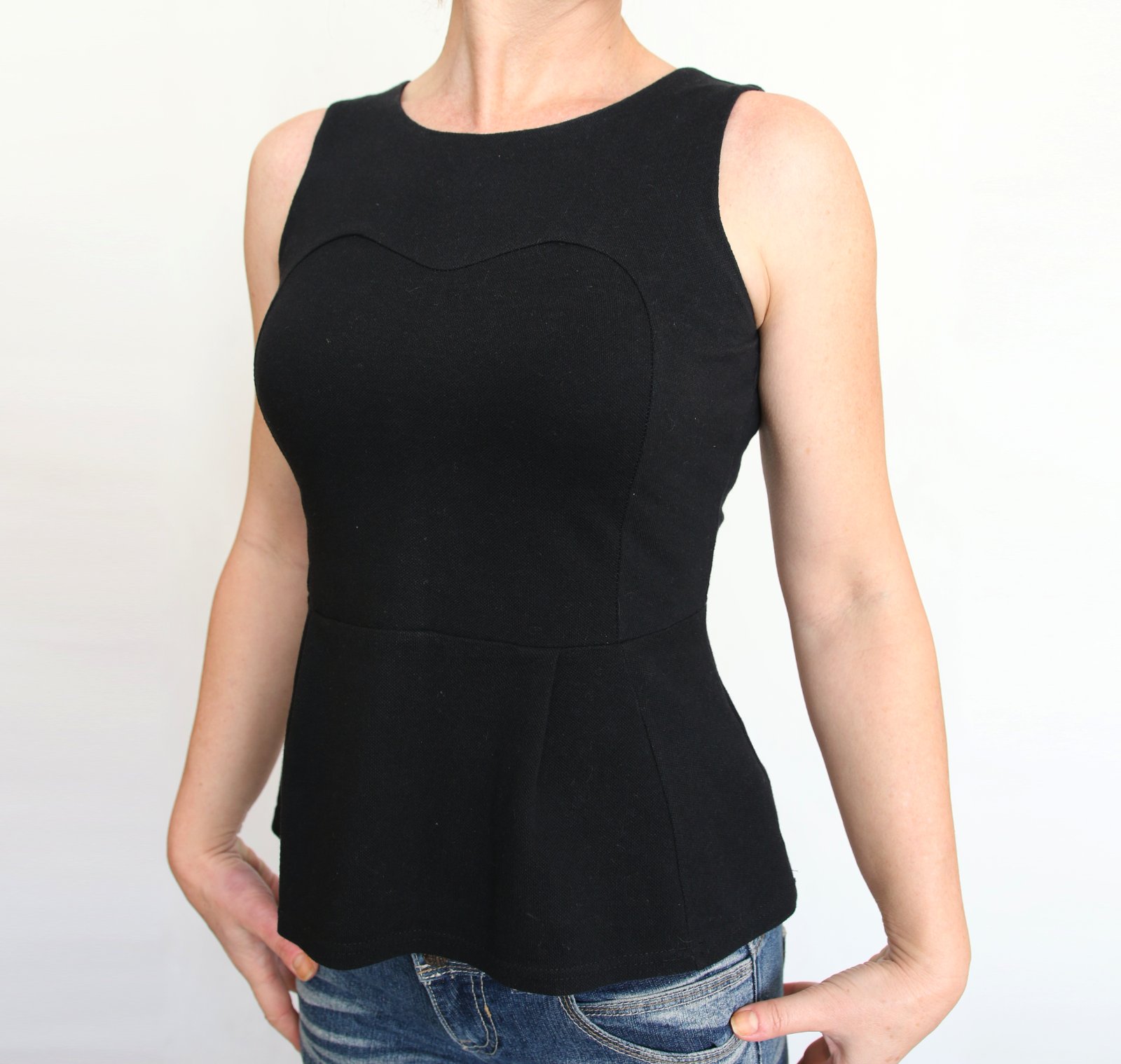 Černé tričko - top bez rukávů ze 100% bavlny. Tlustší materiál tzv. žerzej romanit, díky němu pěkně drží tvar. Střih peplum, sukýnka nabraná zejména ve předu dvěma záševky. Roztomile řešený přední díl se vsadkou do srdíčka krásně tvaruje. Velikost S souhlasí. délka trička 56 cm, do pasu 38 cm, přes prsa 82 cm, pas 71 cm. Měřeno bez natažení. Tričko bylo pár krát nošené, bezvadný stav. Odeslání poštou, Balíkovnou nebo Zásilkovnou, cenu za odeslání sdělím do zprávy.